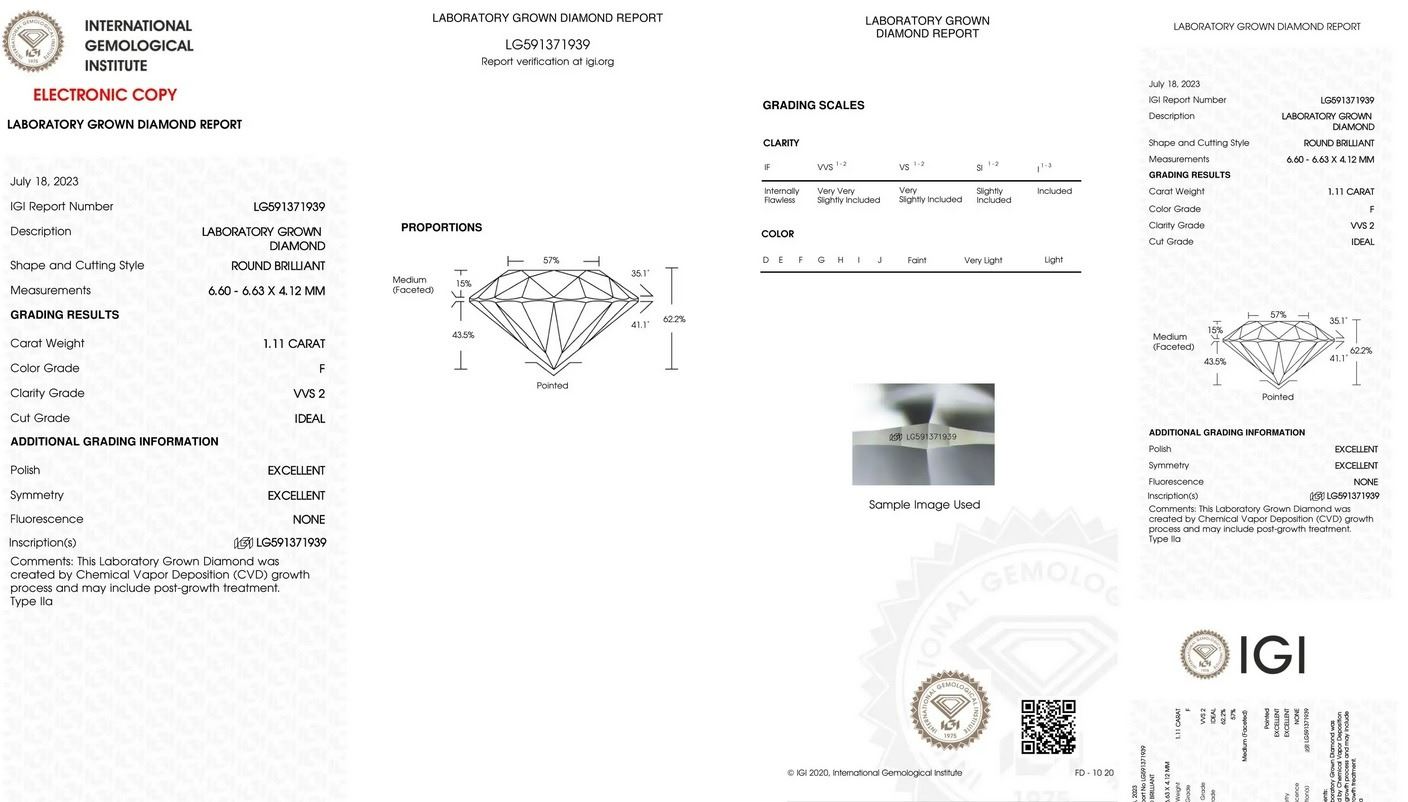 Lab Diamond Description: Shape: Round Size: 6.60mm Quantity: 1: 1.11CT Grade: VVS 2 Color: F Diamond Description: Shape: Rounds Size: 1-1.1mm Quantity: 18: 0.12CT Grade: VVS 2 Color: E-F Material Information: Total Weight: 2.21 grams.Ring Size: 7.5.