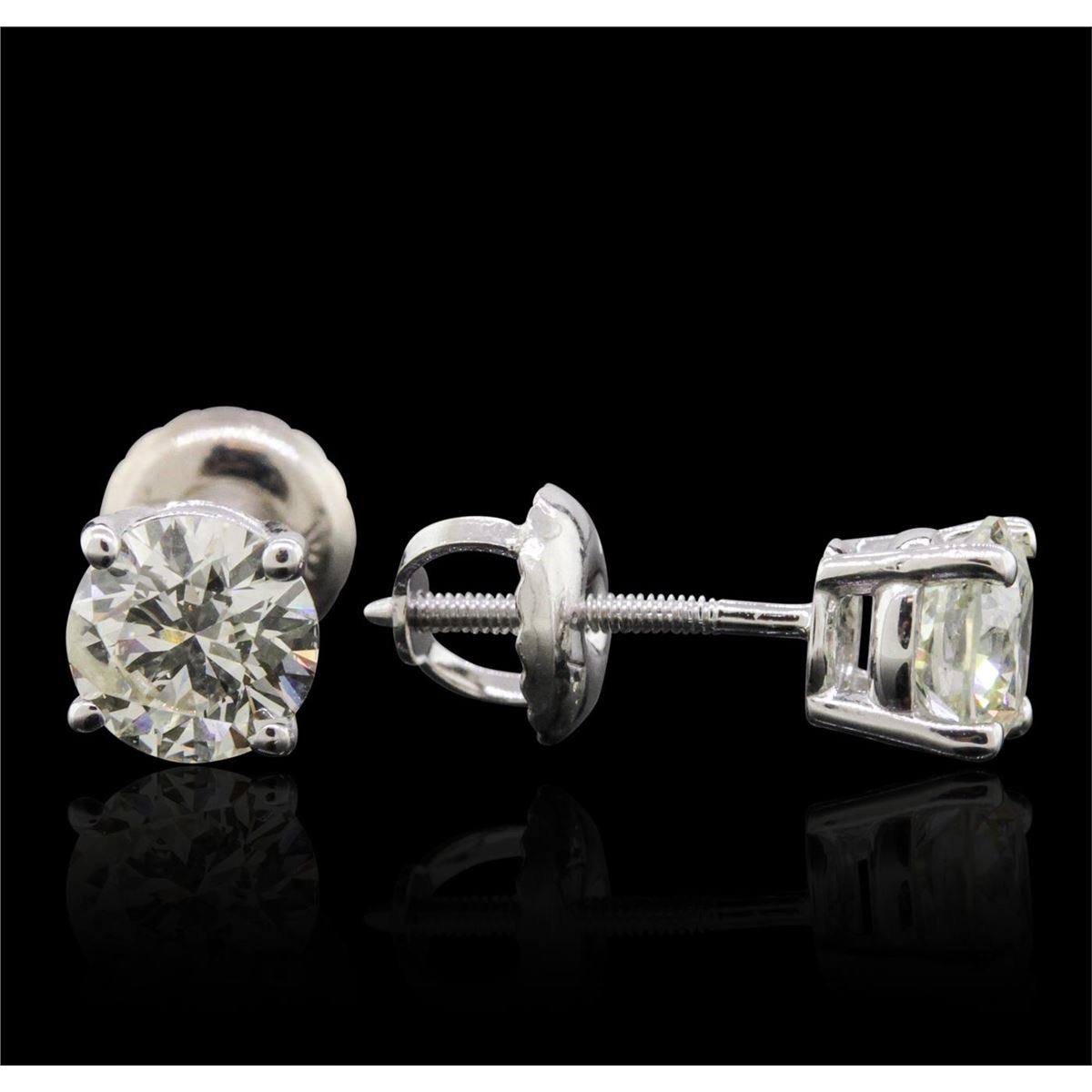 One pair electronically tested 14KT white gold cast & assembled diamond solitaire earrings with screw backs. Bright polish finish. Condition is new, good workmanship. Containing: One prong set round brilliant cut diamond, measuring 5.08 - 5.06 x 3.25mm (depth est.), 4.00% GTCF approximate weight of 0.63ct with a medium blue fluorescence. Graded in the setting. Clarity: I-1. Depth: 64.1%. Table 56.2%. One prong set round brilliant cut diamond, measuring 5.01 - 5.00 x 3.15mm (depth est.), 4.00% GTCF approximate weight of 0.60ct with a medium blue fluorescence. Graded in the setting. Clarity: I-1. Depth: 62.9%. Table 57.9%. Total Weight of Diamonds 1.23ct. Total Weight of Earrings 0.92 grams. AIG Appraised at $3,990.00.