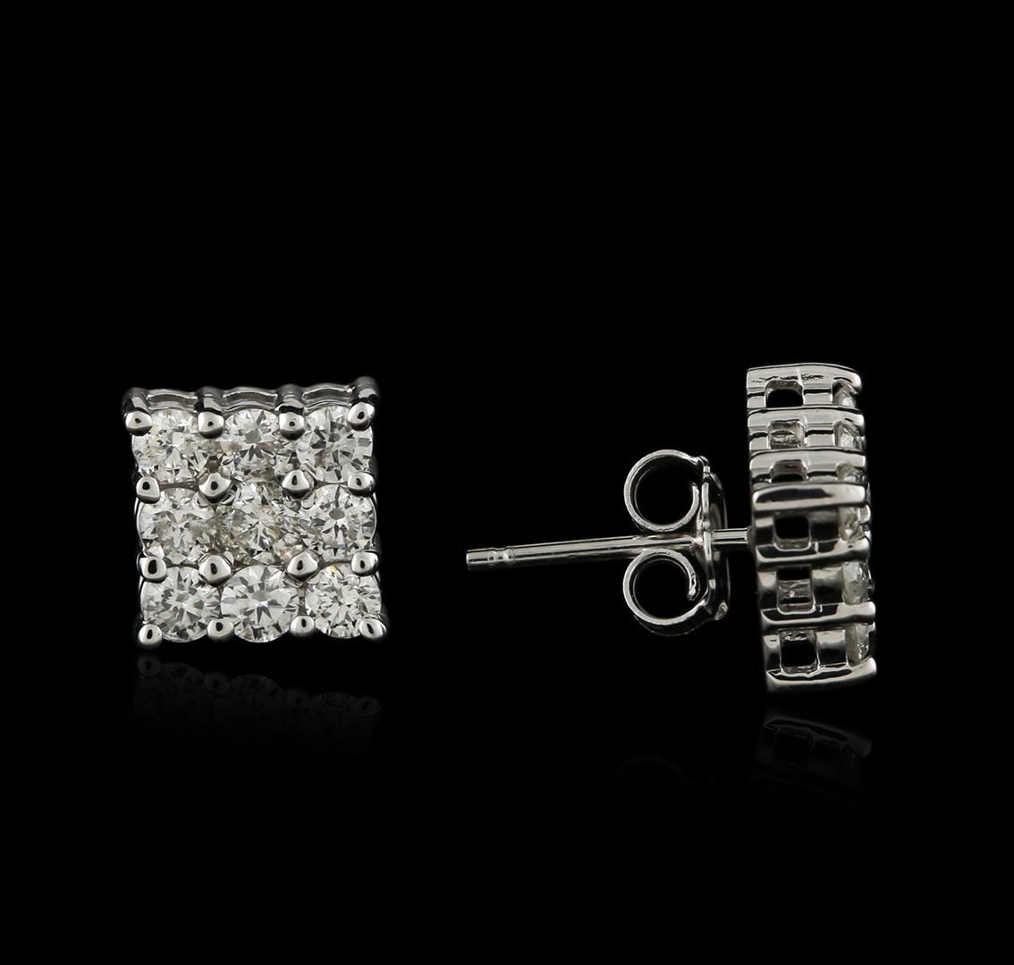One pair electronically tested 14KT white gold ladies cast diamond earrings with friction posts with a bright polish finish. Identified with markings of "585". Condition is new. Containing: Eighteen prong set round brilliant cut diamonds, measuring 2.50 - 2.50 x 1.50mm (depth est.) approximate total weight of 18 Stones = 1.24ct. Clarity: I-1 to I-2. Color: I - J, Cut is Good. Diamonds are graded in the mounting, unless otherwise stated. Total Weight of Diamonds 1.24ct. Total Weight of Earrings 2.70 grams. GGL Appraised at $1,730.00.