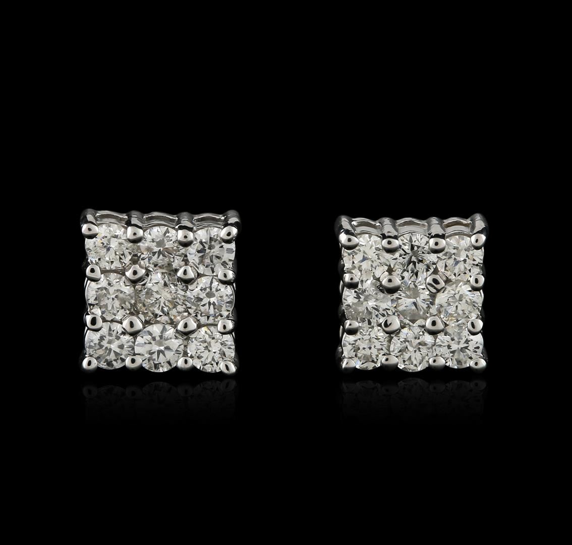 One pair electronically tested 14KT white gold ladies cast diamond earrings with friction posts with a bright polish finish. Identified with markings of "585". Condition is new. Containing: Eighteen prong set round brilliant cut diamonds, measuring 2.50 - 2.50 x 1.50mm (depth est.) approximate total weight of 18 Stones = 1.24ct. Clarity: I-1 to I-2. Color: I - J, Cut is Good. Diamonds are graded in the mounting, unless otherwise stated. Total Weight of Diamonds 1.24ct. Total Weight of Earrings 2.70 grams. GGL Appraised at $1,730.00.
