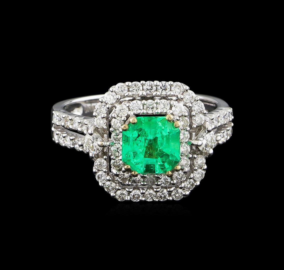 one-half millimeter wide band. Containing: One prong set square step cut natural emerald, measuring 6.45 x 6.40 x 4.18mm, 6% bulge factor, approximate weight of 1.24ct., clarity is moderately included, type III, medium dark, moderately strong, very slightly bluish green color, (GIA vslbG 6/4), cut is good. Transmitting light with a minimum of distortion, transparent. Naturally occurring internal & external characteristics are present. Indications of oil residue. Graded in the setting. Sixty-Six post set round brilliant cut diamonds, measuring 1.60 - 1.50 x 0.93mm (depth est.) approximate total weight of 66 Stones = 1.05ct. Graded in the setting. Clarity: SI-1 to I-1. Color: G - I AIG Appraised at $6,080.00.