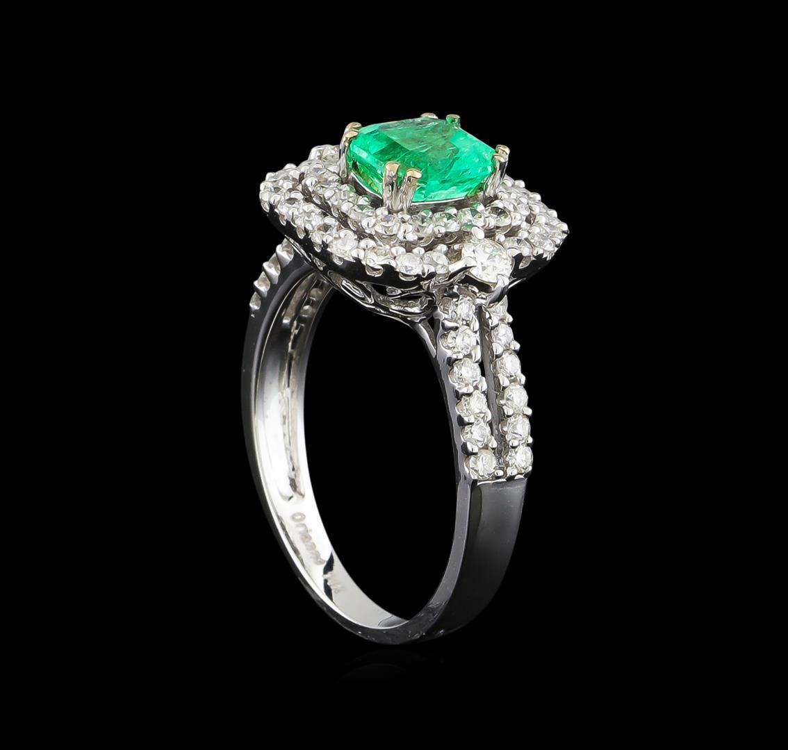 one-half millimeter wide band. Containing: One prong set square step cut natural emerald, measuring 6.45 x 6.40 x 4.18mm, 6% bulge factor, approximate weight of 1.24ct., clarity is moderately included, type III, medium dark, moderately strong, very slightly bluish green color, (GIA vslbG 6/4), cut is good. Transmitting light with a minimum of distortion, transparent. Naturally occurring internal & external characteristics are present. Indications of oil residue. Graded in the setting. Sixty-Six post set round brilliant cut diamonds, measuring 1.60 - 1.50 x 0.93mm (depth est.) approximate total weight of 66 Stones = 1.05ct. Graded in the setting. Clarity: SI-1 to I-1. Color: G - I AIG Appraised at $6,080.00.