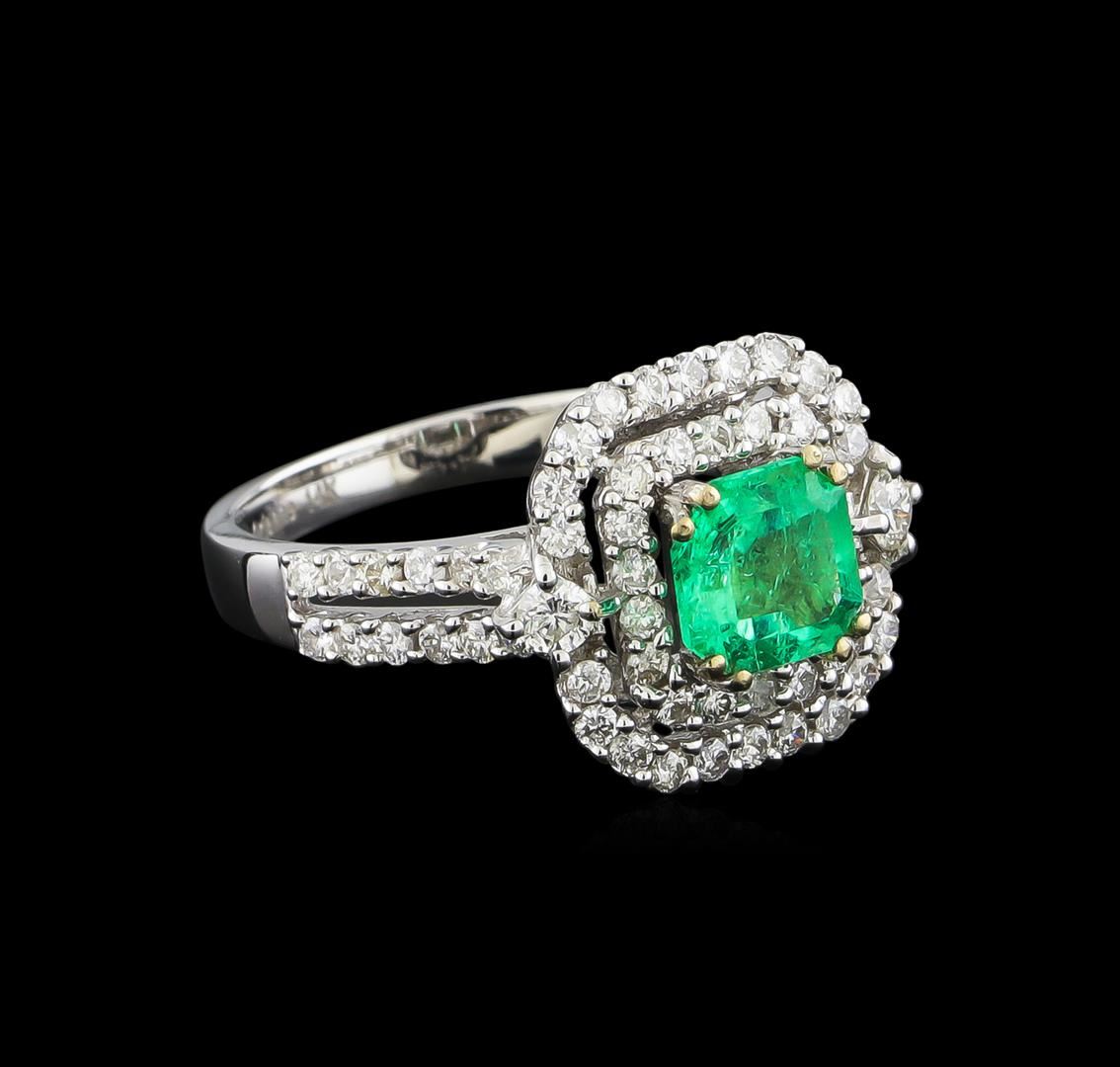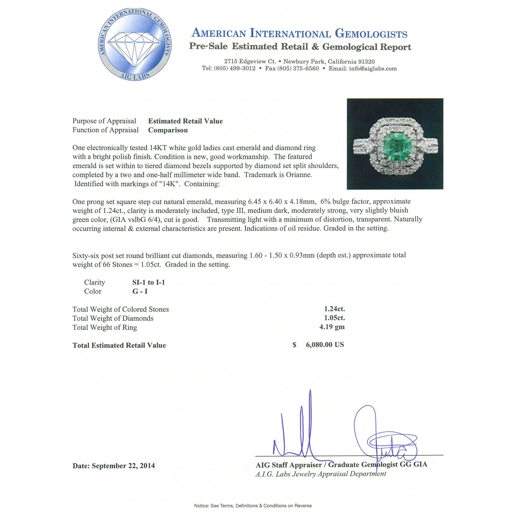 one-half millimeter wide band. Containing: One prong set square step cut natural emerald, measuring 6.45 x 6.40 x 4.18mm, 6% bulge factor, approximate weight of 1.24ct., clarity is moderately included, type III, medium dark, moderately strong, very slightly bluish green color, (GIA vslbG 6/4), cut is good. Transmitting light with a minimum of distortion, transparent. Naturally occurring internal & external characteristics are present. Indications of oil residue. Graded in the setting. Sixty-Six post set round brilliant cut diamonds, measuring 1.60 - 1.50 x 0.93mm (depth est.) approximate total weight of 66 Stones = 1.05ct. Graded in the setting. Clarity: SI-1 to I-1. Color: G - I AIG Appraised at $6,080.00.
