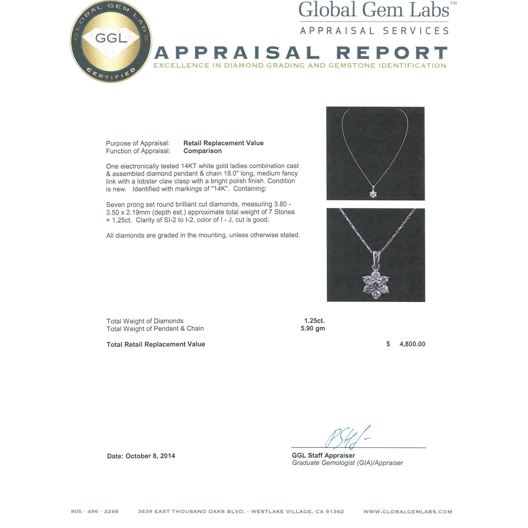 One electronically tested 14KT white gold ladies combination cast & assembled diamond pendant & chain 18.0" long, medium fancy link with a lobster claw clasp with a bright polish finish. Identified with markings of "14K". Condition is new. Containing: Seven prong set round brilliant cut diamonds, measuring 3.80 - 3.50 x 2.19mm (depth est.) approximate total weight of 7 Stones = 1.25ct. Clarity: SI-2 to I-2. Color: I - J, Cut is Good. All diamonds are graded in the mounting, unless otherwise stated. Total Weight of Diamonds 1.25ct. Total Weight of Pendant & Chain 5.90 grams. GGL Appraised at $4,800.00.