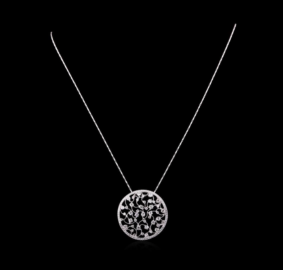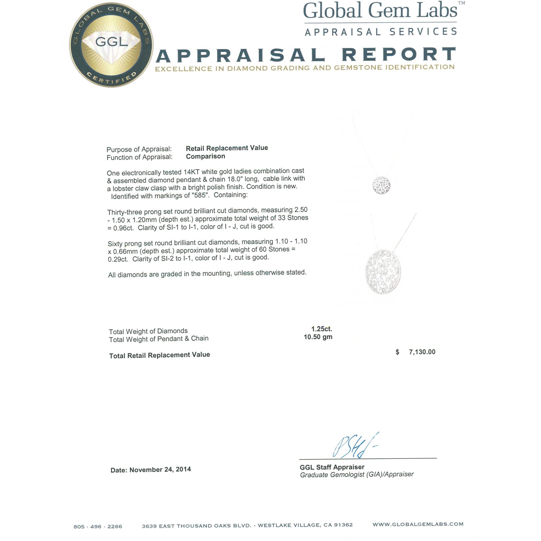 One electronically tested 14KT white gold ladies combination cast & assembled diamond pendant & chain 18.0" long, cable link with a lobster claw clasp with a bright polish finish. Identified with markings of "585". Condition is new. Containing: Thirty-Three prong set round brilliant cut diamonds, measuring 2.50 - 1.50 x 1.20mm (depth est.) approximate total weight of 33 Stones = 0.96ct. Clarity: SI-1 to I-1. Color: I - J, Cut is Good. Sixty prong set round brilliant cut diamonds, measuring 1.10 - 1.10 x 0.66mm (depth est.) approximate total weight of 60 Stones = 0.29ct. Clarity: SI-2 to I-1. Color: I - J, Cut is Good. All diamonds are graded in the mounting, unless otherwise stated. Total Weight of Diamonds 1.25ct. Total Weight of Pendant & Chain 10.50 grams. GGL Appraised.