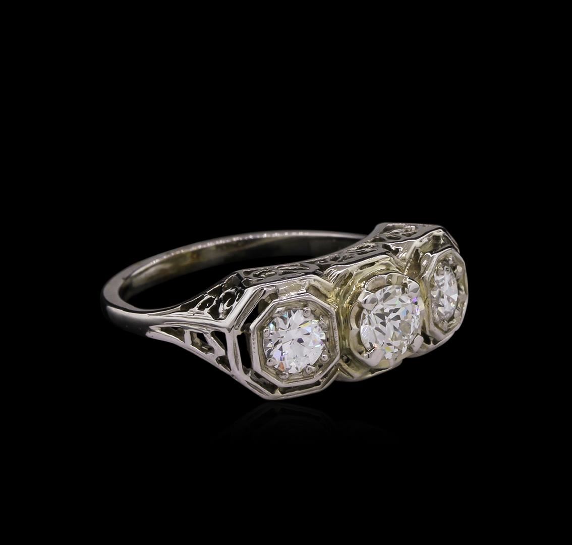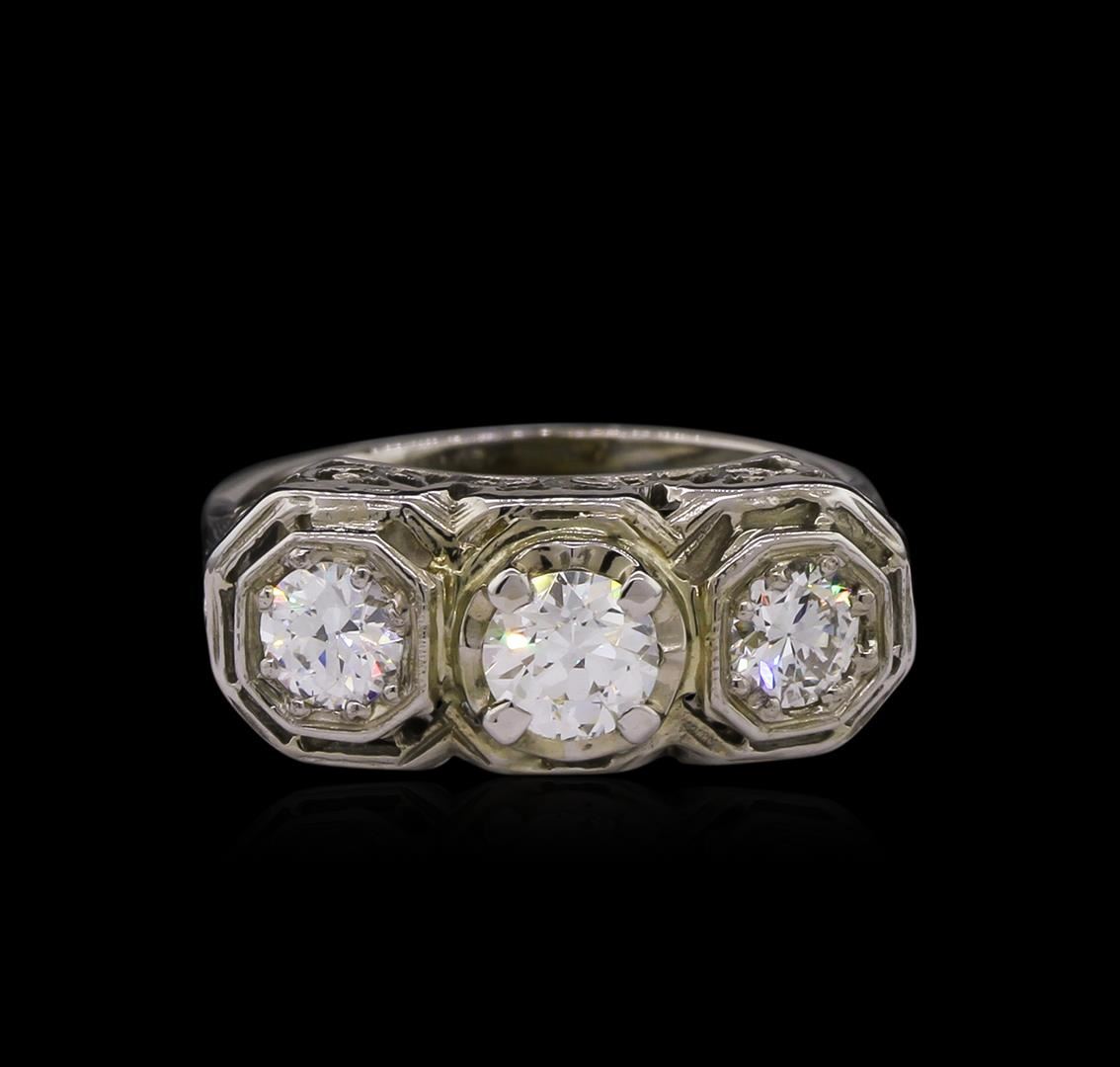 One electronically tested 14KT white gold ladies cast diamond ring with a bright polish finish. The ring features a diamond trio supported by an elaborate lattice under gallery, completed by a one and one-half millimeter wide band. The ring is reminiscent of the jewelry designs from the Edwardian Period. Lace translated into diamonds. This is the phrase used to describe Edwardian jewelry. The Edwardian Period was a short period, dating from 1901 to 1910, during the reign of King Edward VIII, son of Queen Victoria It had its roots in the final years of the Victorian period. Diamonds were made to look as fine and delicate as possible. Princess Alexandra, Edward's wife, and the Princess of Wales had a great influence on the jewelry of the period. Edwardian jewelry was the first to reflect a dramatic progress made in gem stone cutting. Condition is good. Containing: One prong set Old European cut diamond, measuring 5.26 - 5.25 x 3.00mm (depth est.) approximate weight of 0.60ct with a faint blue fluorescence. Cutting style circa early 20th century. Graded in the setting. Clarity: SI-1. Color: I Two prong set round brilliant cut diamonds, measuring 4.30 - 4.20 x 2.50mm (depth est.) approximate total weight of 2 Stones = 0.65ct. Graded in the setting. Clarity: VS-2 to SI-1. Color: H - I. Total Weight of Diamonds 1.25ct. Total Weight of Ring 3.92 grams. AIG Appraised at $7,545.00.