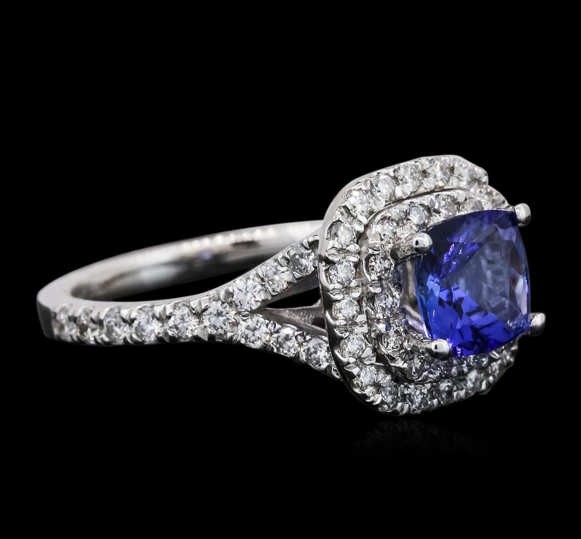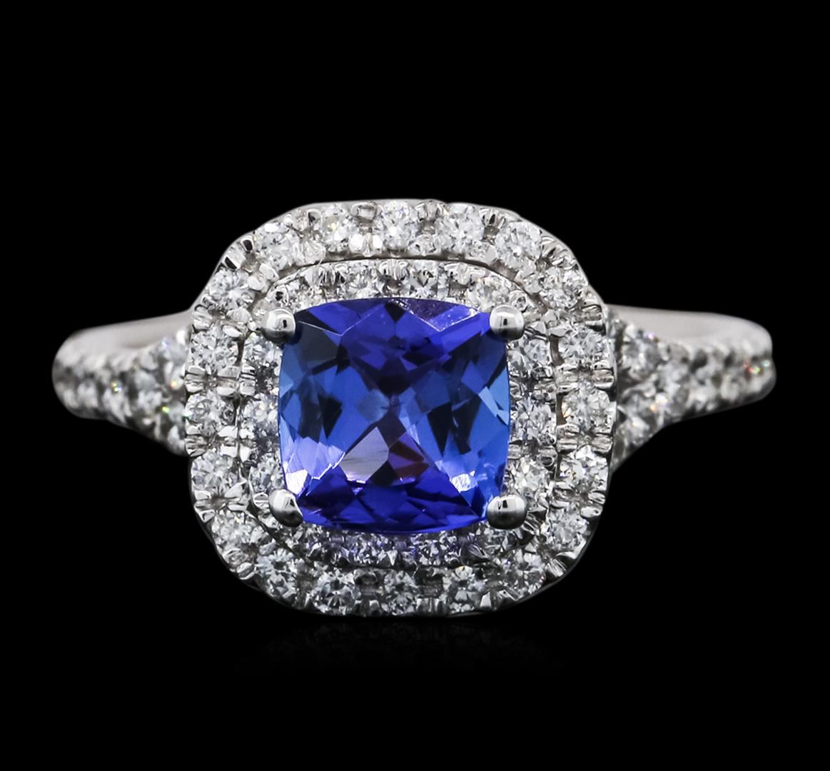 One electronically tested 14KT white gold ladies cast tanzanite & diamond ring with a bright finish. The featured tanzanite is set within a tiered diamond bezel, supported by diamond set shoulders, completed by a two millimeter wide band. Identified with markings of "14K". Condition is new, good workmanship. Containing: One prong set square cushion brilliant cut natural tanzanite, measuring 6.50 x 6.40 x 3.82mm, approximate weight of 1.25ct., clarity is slightly included, type I, medium dark, very slightly grayish, violetish blue color, (GIA vB 6/3), cut is good. Transmitting light with no distortion, transparent. Graded in the setting. Tanzanite is a very rare gemstone that is only found in the country of Tanzania. Originally discovered in 1967. Tiffany & Company, named the stone Tanzanite. It is found in the Usumburu Mountains that border the Umba Valley of northern Tanzania. Tanzanite occurs in gray, brown, violet, blue, reddish-purple, & green. The gem is interesting because of its exceptional pleochroism. Rotated in different directions a tanzanite will exhibit multiple changes of color. Tanzanite has a low tolerance to ultrasonic cleaning, and should not be cleaned using this method. Fifty-Eight prong set round brilliant cut diamonds, measuring 1.60 - 1.40 x 0.90mm (depth est.) approximate total weight of 58 Stones = 0.74ct. Graded in the setting. Clarity: SI-2 to I-1. Color: H - J. Total Weight of Colored Stones 1.25ct. Total Weight of Diamonds 0.74ct. Total Weight of Ring 5.07 grams. AIG Appraised at $5,430.00.