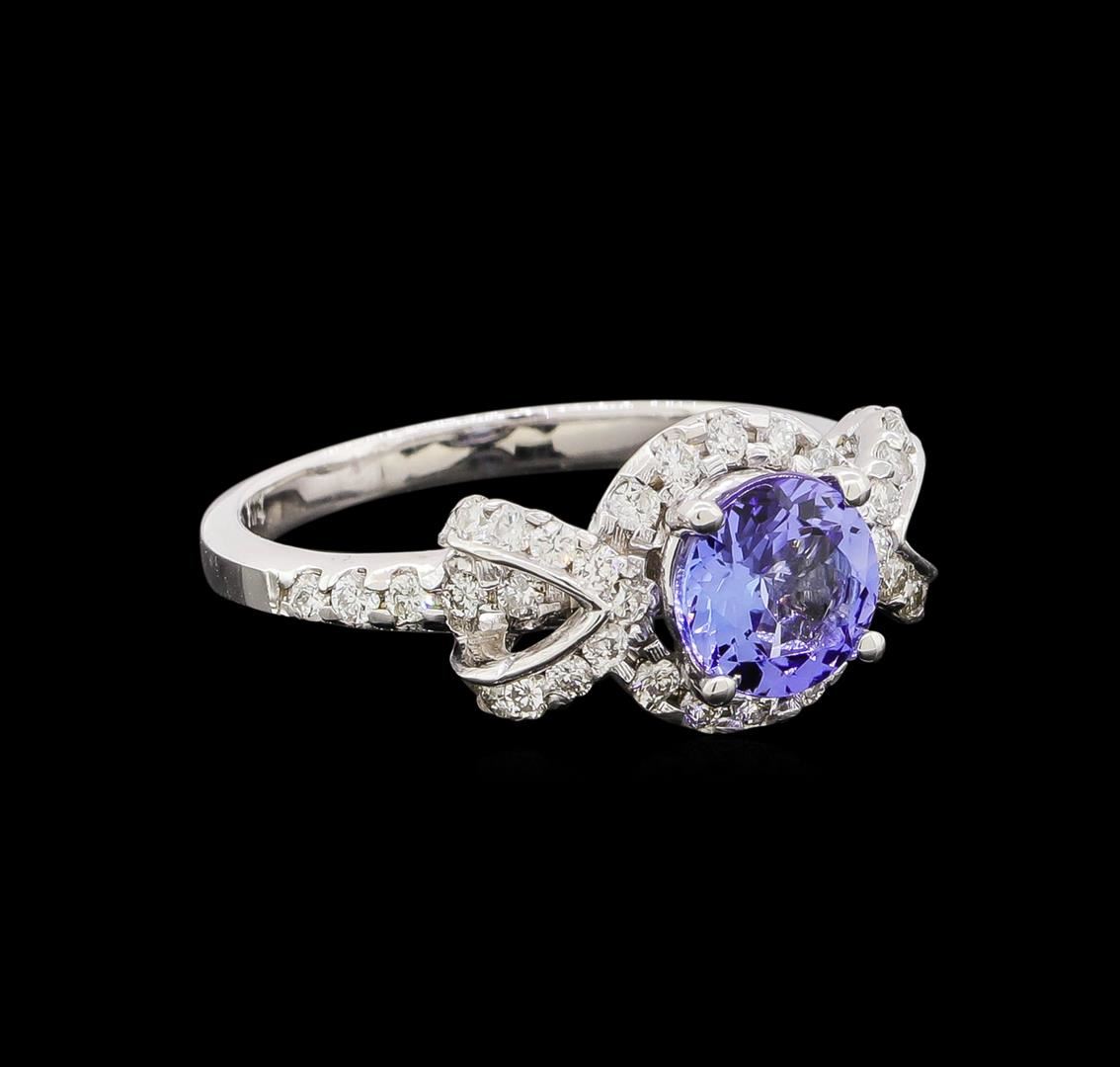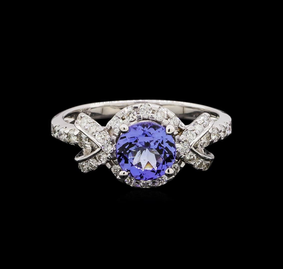 One electronically tested 14KT white gold ladies combination cast & assembled tanzanite and diamond ring with a bright polish finish. Identified with markings of "14K". Condition is new. Containing: One prong set round modified brilliant cut natural tanzanite, measuring 6.60 - 6.60 x 4.29 mm, approximate weight of 1.25ct., clarity is eye clean, type I, medium light, very slightly grayish, violet color, (GIA V 4/3), cut is good. Thirty-Five prong set round brilliant cut diamonds, measuring 1.20 - 1.20 x 0.72mm (depth est.) approximate total weight of 35 Stones = 0.22ct. Clarity: SI-2 to I-1. Color: I - J, Cut is Good. Colored gemstones are presumed to have been subjected to commonly used enhancement processes. All diamonds and colored gemstones are graded in the mounting, unless otherwise stated. Total Weight of Colored Stones 1.25ct. Total Weight of Diamonds 0.22ct. Total Weight of Ring 3.50 grams. GGL Appraised at $2,755.00.