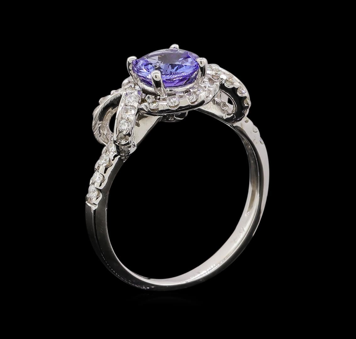 One electronically tested 14KT white gold ladies combination cast & assembled tanzanite and diamond ring with a bright polish finish. Identified with markings of "14K". Condition is new. Containing: One prong set round modified brilliant cut natural tanzanite, measuring 6.60 - 6.60 x 4.29 mm, approximate weight of 1.25ct., clarity is eye clean, type I, medium light, very slightly grayish, violet color, (GIA V 4/3), cut is good. Thirty-Five prong set round brilliant cut diamonds, measuring 1.20 - 1.20 x 0.72mm (depth est.) approximate total weight of 35 Stones = 0.22ct. Clarity: SI-2 to I-1. Color: I - J, Cut is Good. Colored gemstones are presumed to have been subjected to commonly used enhancement processes. All diamonds and colored gemstones are graded in the mounting, unless otherwise stated. Total Weight of Colored Stones 1.25ct. Total Weight of Diamonds 0.22ct. Total Weight of Ring 3.50 grams. GGL Appraised at $2,755.00.
