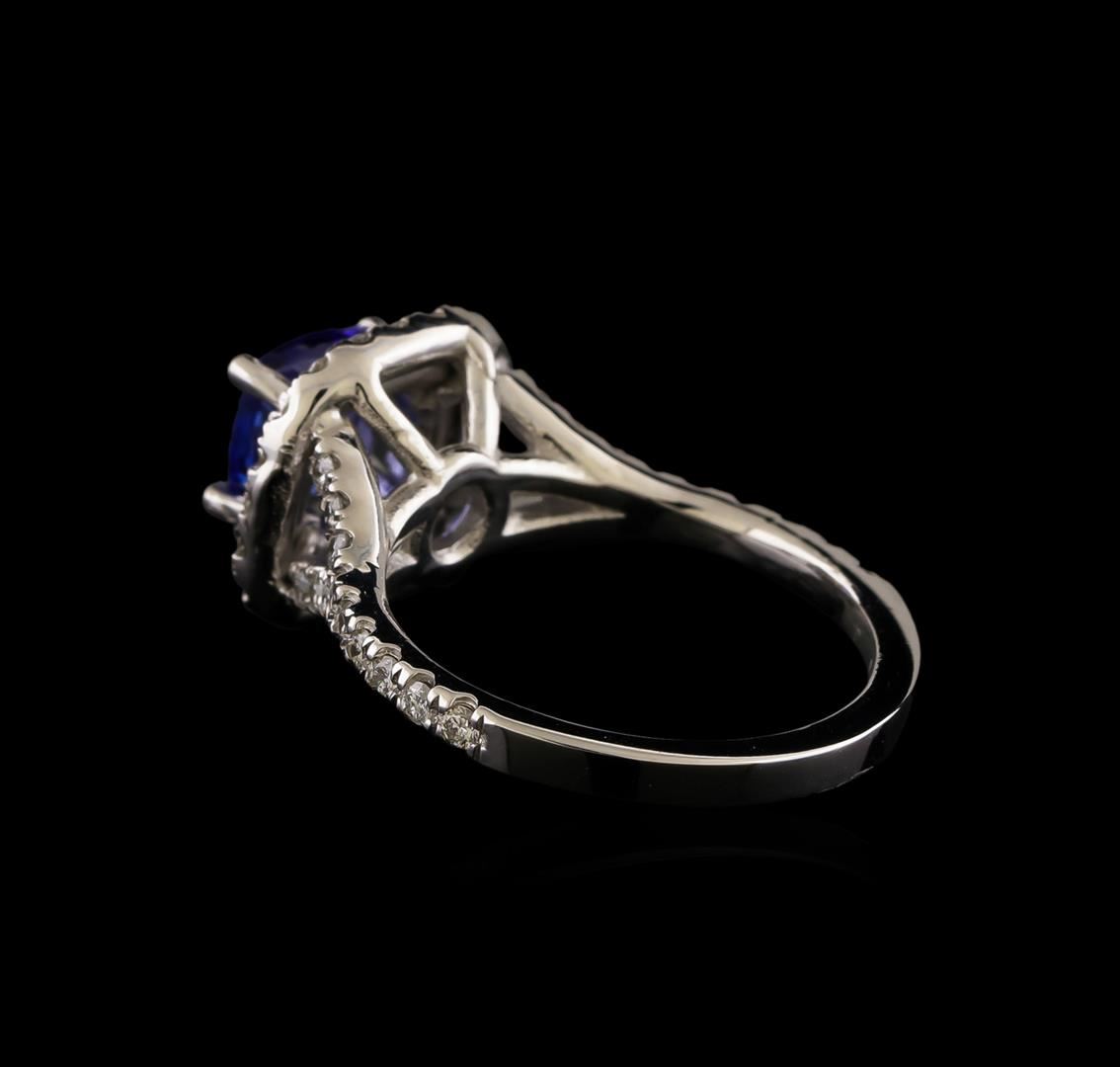 One electronically tested 14KT white gold ladies cast tanzanite & diamond ring with a bright finish. The featured tanzanite is set within a tiered diamond bezel, supported by diamond set shoulders, completed by a two millimeter wide band. Identified with markings of "14K". Condition is new, good workmanship. Containing: One prong set square cushion brilliant cut natural tanzanite, measuring 6.50 x 6.40 x 3.82mm, approximate weight of 1.25ct., clarity is slightly included, type I, medium dark, very slightly grayish, violetish blue color, (GIA vB 6/3), cut is good. Transmitting light with no distortion, transparent. Graded in the setting. Tanzanite is a very rare gemstone that is only found in the country of Tanzania. Originally discovered in 1967. Tiffany & Company, named the stone Tanzanite. It is found in the Usumburu Mountains that border the Umba Valley of northern Tanzania. Tanzanite occurs in gray, brown, violet, blue, reddish-purple, & green. The gem is interesting because of its exceptional pleochroism. Rotated in different directions a tanzanite will exhibit multiple changes of color. Tanzanite has a low tolerance to ultrasonic cleaning, and should not be cleaned using this method. Fifty-Eight prong set round brilliant cut diamonds, measuring 1.60 - 1.40 x 0.90mm (depth est.) approximate total weight of 58 Stones = 0.74ct. Graded in the setting. Clarity: SI-2 to I-1. Color: H - J. Total Weight of Colored Stones 1.25ct. Total Weight of Diamonds 0.74ct. Total Weight of Ring 5.07 grams. AIG Appraised at $5,430.00.