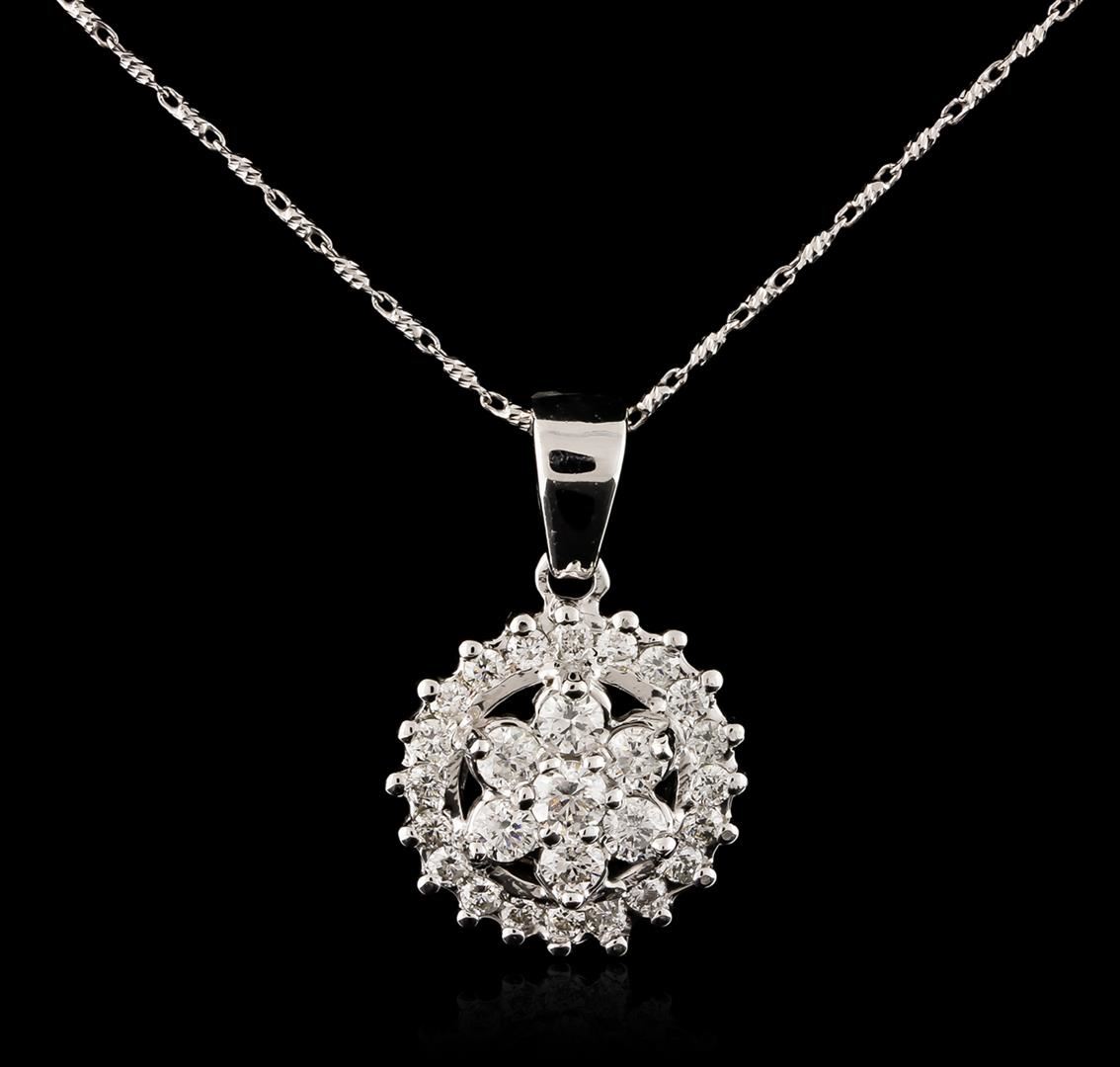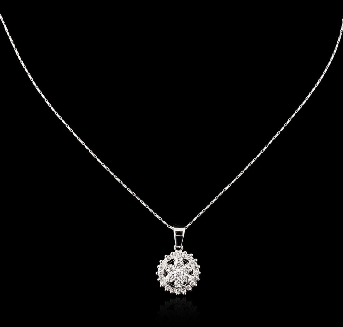 One electronically tested 14KT white gold ladies cast diamond pendant & chain 18.0" long, with a spring ring clasp with a bright polish finish. Identified with markings of "14K". Condition is new. Containing: Seven prong set round brilliant cut diamonds, measuring 3.40 - 3.40 x 2.04mm (depth est.) approximate total weight of 7 Stones = 1.01ct. Clarity: SI-2 to I-1. Color: G - H, Cut is Good. Twenty prong set round brilliant cut diamonds, measuring 1.50 - 1.50 x 0.90mm (depth est.) approximate total weight of 20 Stones = 0.25ct. Clarity: SI-1 to I-1. Color: I - J, Cut is Good. All diamonds are graded in the mounting, unless otherwise stated. Total Weight of Diamonds 1.25ct. Total Weight of Pendant & Chain 6.60 grams. GGL Appraised at $3,985.00.
