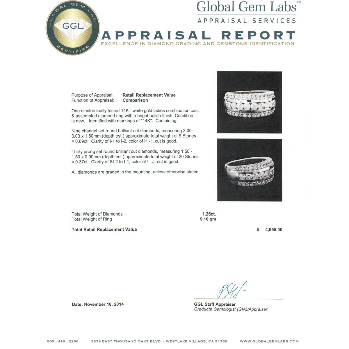One electronically tested 14KT white gold ladies combination cast & assembled diamond ring with a bright polish finish. Identified with markings of "14K". Condition is new. Containing: Nine channel set round brilliant cut diamonds, measuring 3.00 - 3.00 x 1.80mm (depth est.) approximate total weight of 9 Stones = 0.89ct. Clarity: I-1 to I-2. Color: H - I, Cut is Good. Thirty prong set round brilliant cut diamonds, measuring 1.50 - 1.50 x 0.90mm (depth est.) approximate total weight of 30 Stones = 0.37ct. Clarity: SI-2 to I-1. Color: I - J, Cut is Good. All diamonds are graded in the mounting, unless otherwise stated. Total Weight of Diamonds 1.26ct. Total Weight of Ring 9.10 grams. GGL Appraised at $4,955.00.