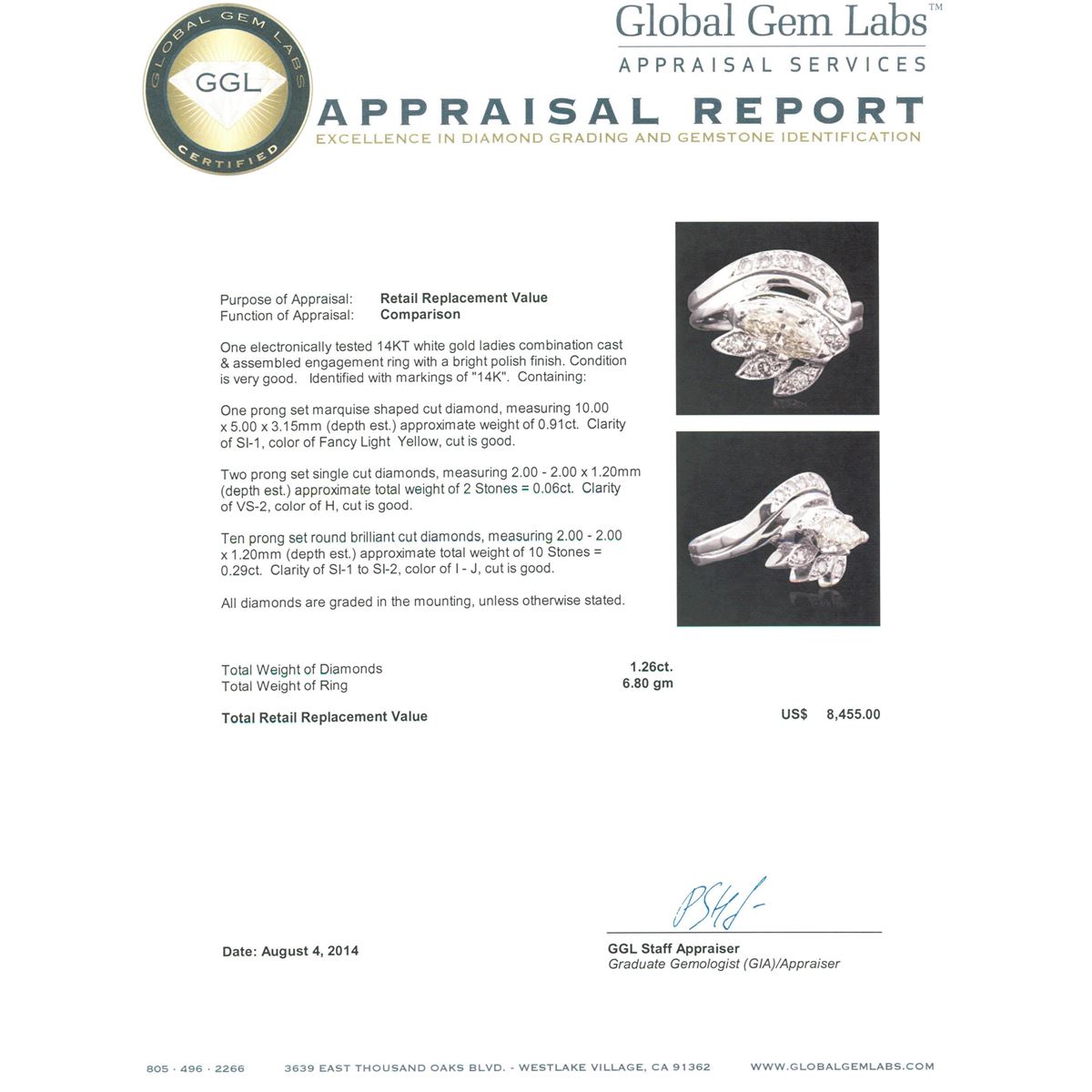 One electronically tested 14KT white gold ladies combination cast & assembled engagement ring with a bright polish finish. Condition is very good. Identified with markings of "14K". Containing: One prong set marquise shaped cut diamond, measuring 10.00 x 5.00 x 3.15mm (depth est.) approximate weight of 0.91ct. Clarity: SI-1, Cut is Good. Two prong set single cut diamonds, measuring 2.00 - 2.00 x 1.20mm (depth est.) approximate. Total Weight of 2 Stones = 0.06ct. Clarity: VS-2. Color: H, Cut is Good. Ten prong set round brilliant cut diamonds, measuring 2.00 - 2.00 x 1.20mm (depth est.) approximate. Total Weight of 10 Stones = 0.29ct. Clarity: SI-1 to SI-2. Color: I - J, Cut is Good. All diamonds are graded in the mounting, unless otherwise stated. Total Weight of Diamonds 1.26ct. Total Weight of Ring 6.80 grams. GGL Appraised at $8,455.00.
