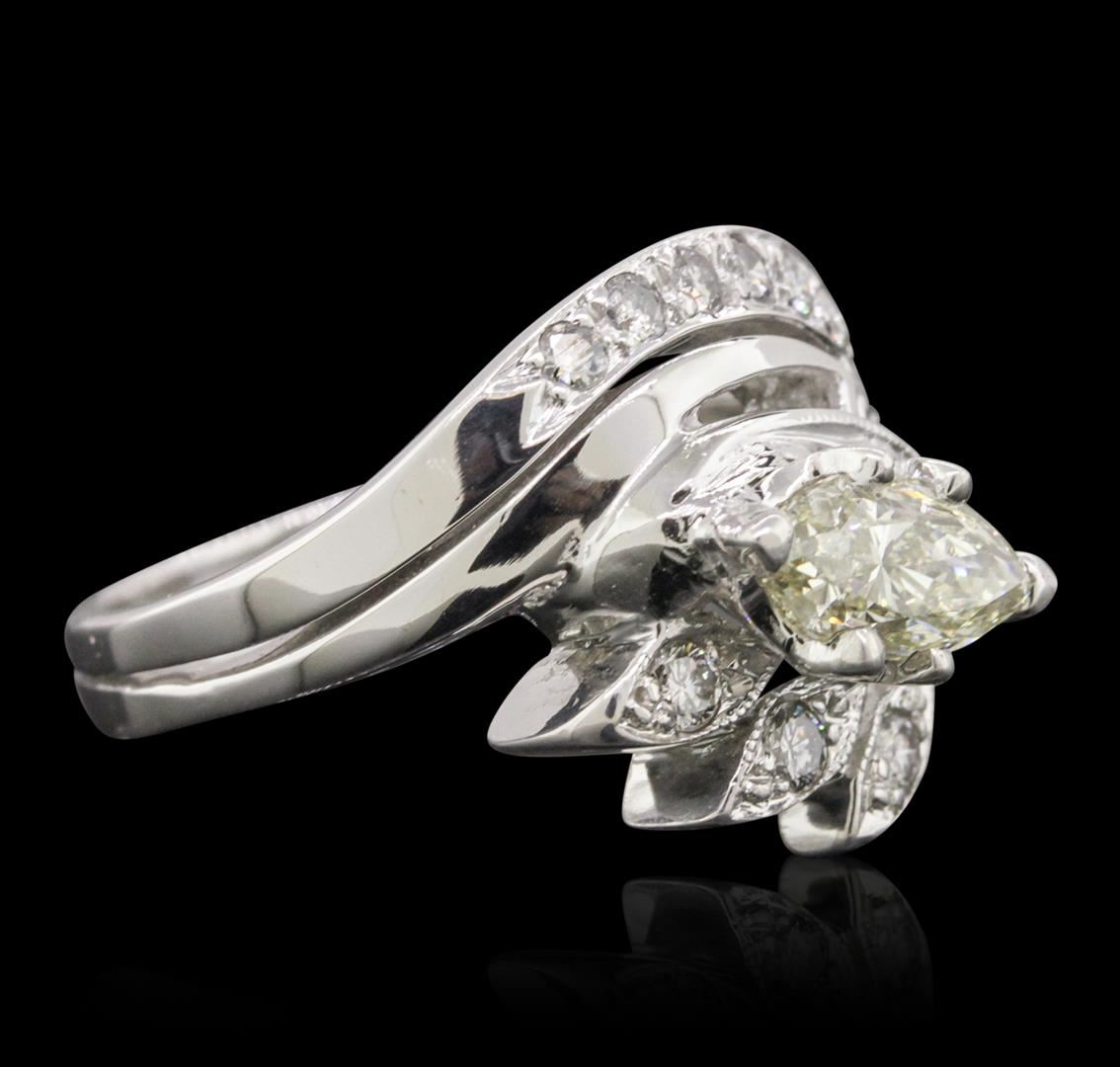 One electronically tested 14KT white gold ladies combination cast & assembled engagement ring with a bright polish finish. Condition is very good. Identified with markings of "14K". Containing: One prong set marquise shaped cut diamond, measuring 10.00 x 5.00 x 3.15mm (depth est.) approximate weight of 0.91ct. Clarity: SI-1, Cut is Good. Two prong set single cut diamonds, measuring 2.00 - 2.00 x 1.20mm (depth est.) approximate. Total Weight of 2 Stones = 0.06ct. Clarity: VS-2. Color: H, Cut is Good. Ten prong set round brilliant cut diamonds, measuring 2.00 - 2.00 x 1.20mm (depth est.) approximate. Total Weight of 10 Stones = 0.29ct. Clarity: SI-1 to SI-2. Color: I - J, Cut is Good. All diamonds are graded in the mounting, unless otherwise stated. Total Weight of Diamonds 1.26ct. Total Weight of Ring 6.80 grams. GGL Appraised at $8,455.00.