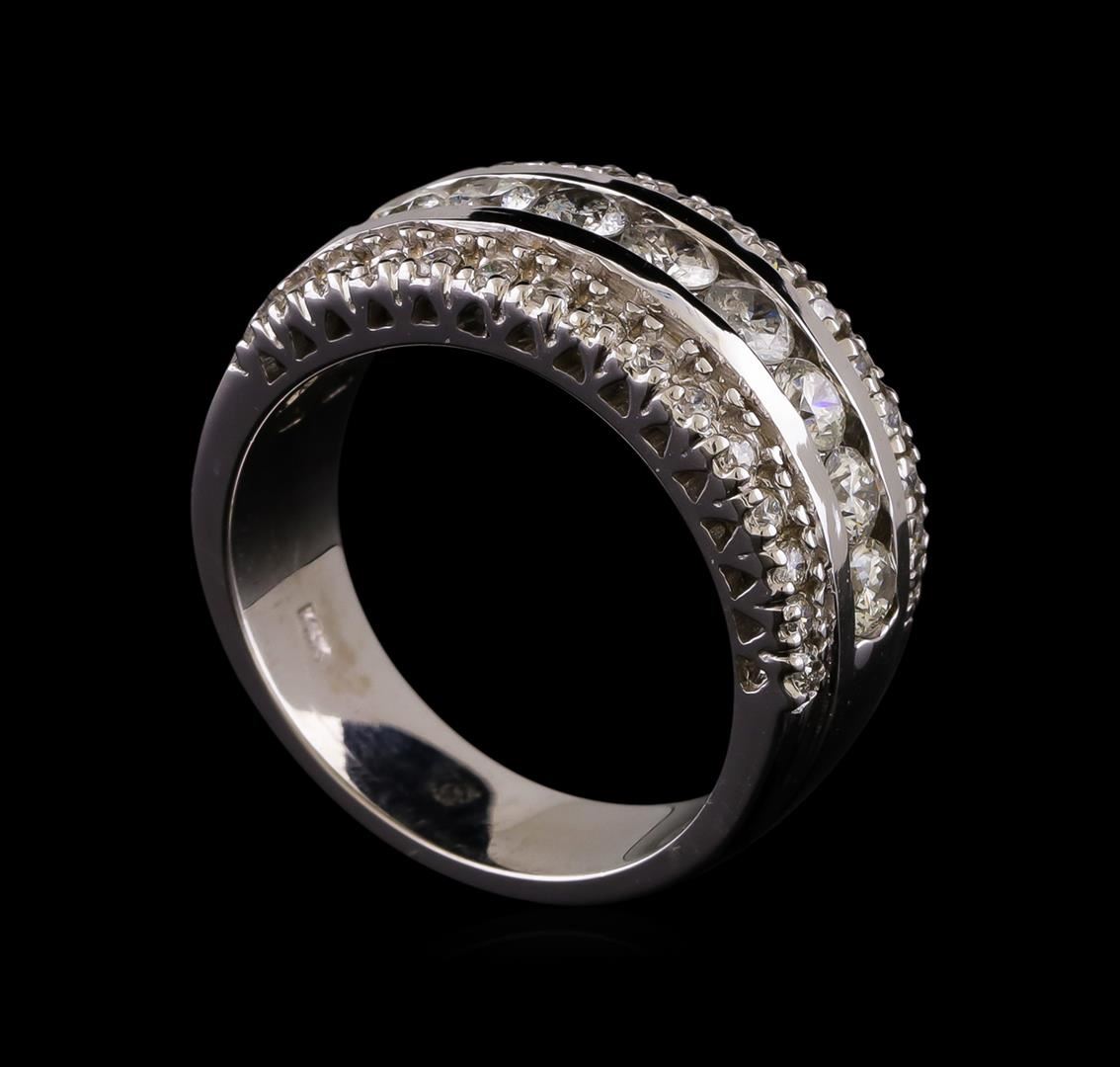 One electronically tested 14KT white gold ladies combination cast & assembled diamond ring with a bright polish finish. Identified with markings of "14K". Condition is new. Containing: Nine channel set round brilliant cut diamonds, measuring 3.00 - 3.00 x 1.80mm (depth est.) approximate total weight of 9 Stones = 0.89ct. Clarity: I-1 to I-2. Color: H - I, Cut is Good. Thirty prong set round brilliant cut diamonds, measuring 1.50 - 1.50 x 0.90mm (depth est.) approximate total weight of 30 Stones = 0.37ct. Clarity: SI-2 to I-1. Color: I - J, Cut is Good. All diamonds are graded in the mounting, unless otherwise stated. Total Weight of Diamonds 1.26ct. Total Weight of Ring 9.10 grams. GGL Appraised.