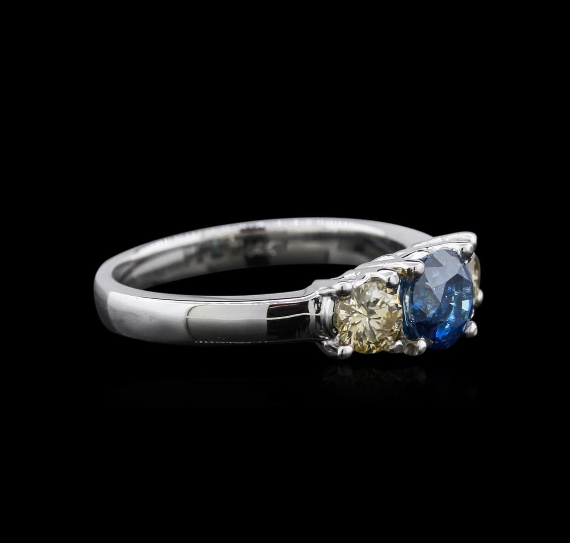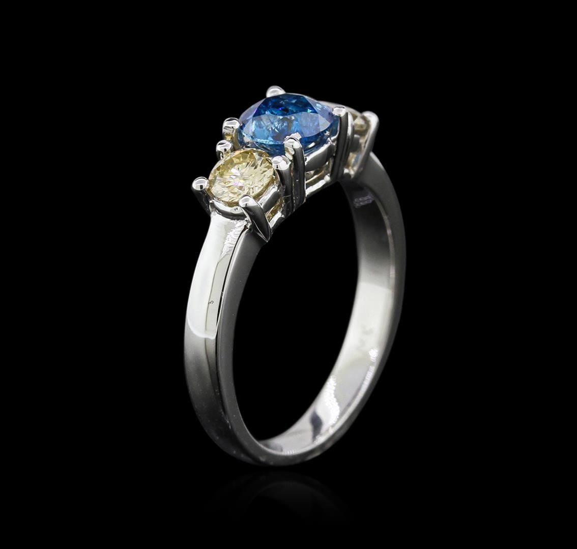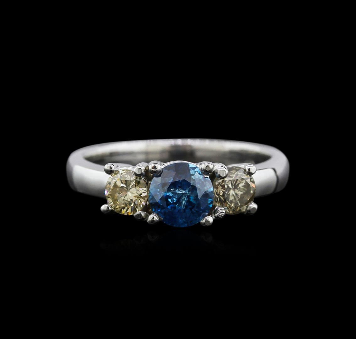 One ring featuring: 14KT white gold weighing 3.70 grams containing one blue diamond center stone with a total weight of 0.70ct and two side diamonds with a total weight of 0.56ct.