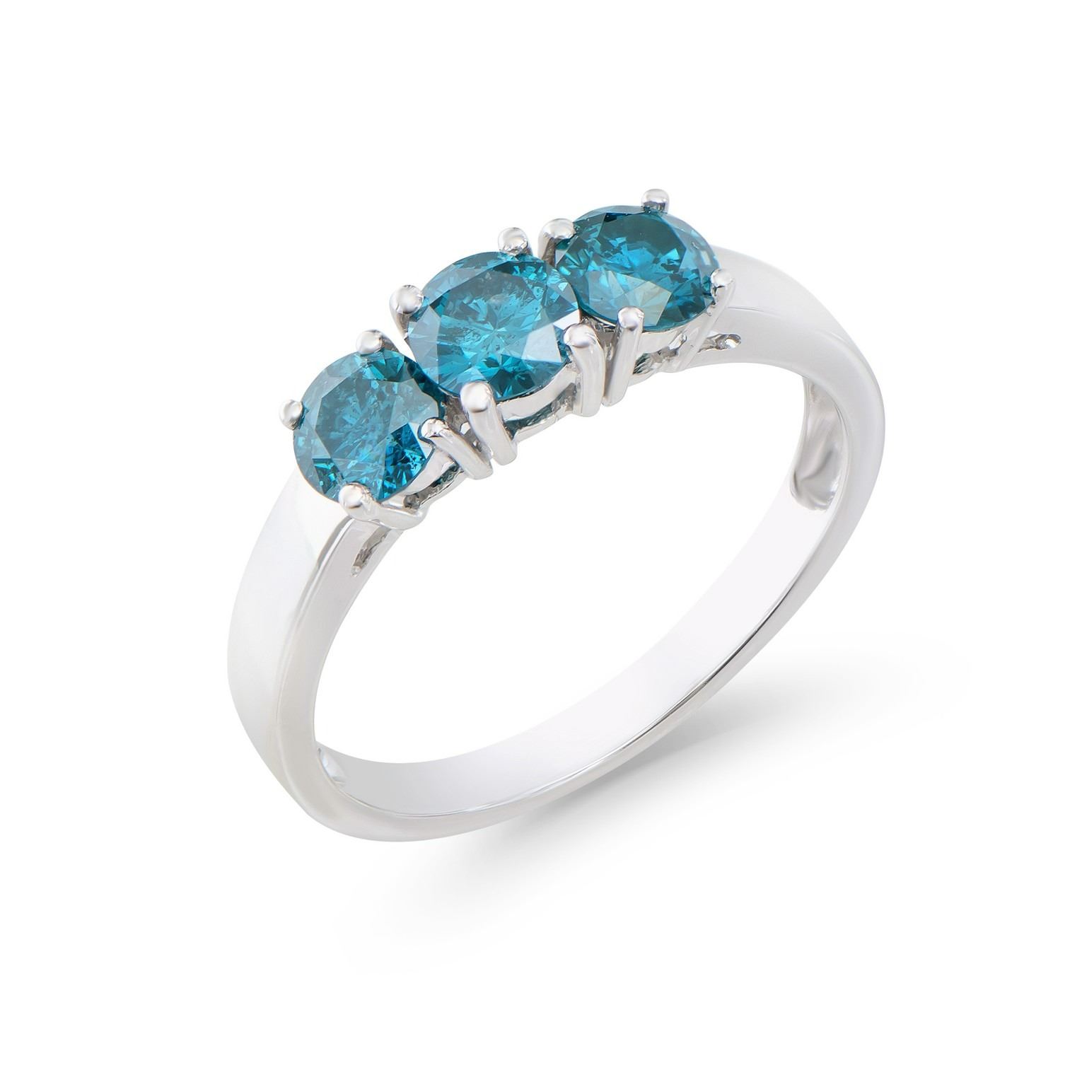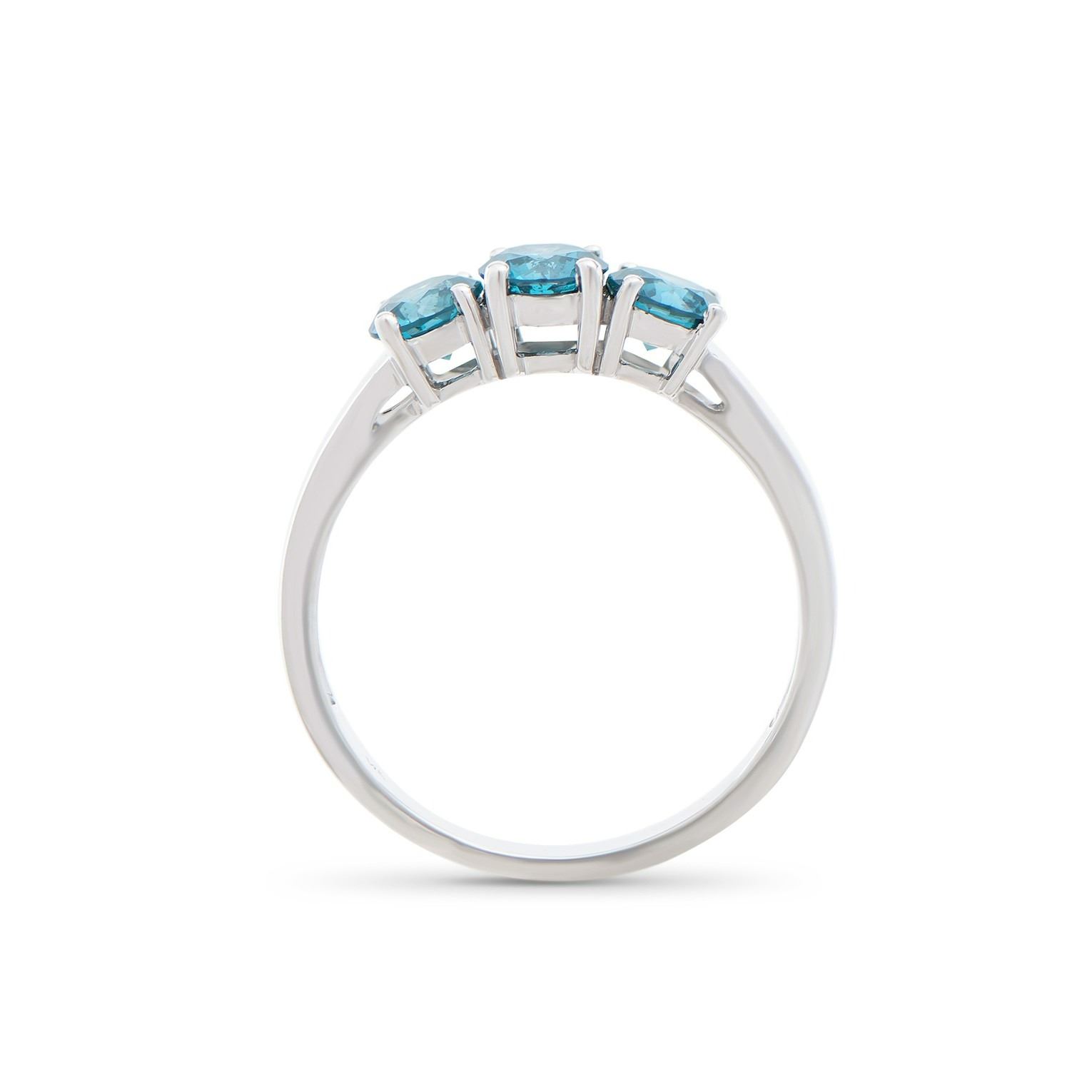 (3) round Dark Blue Diamonds with a total weight of 1.26cts with a color of Dark Blue and clarity of I1-I2. Total weight of this ring is 2.3 grams. Ring size is 7.5.