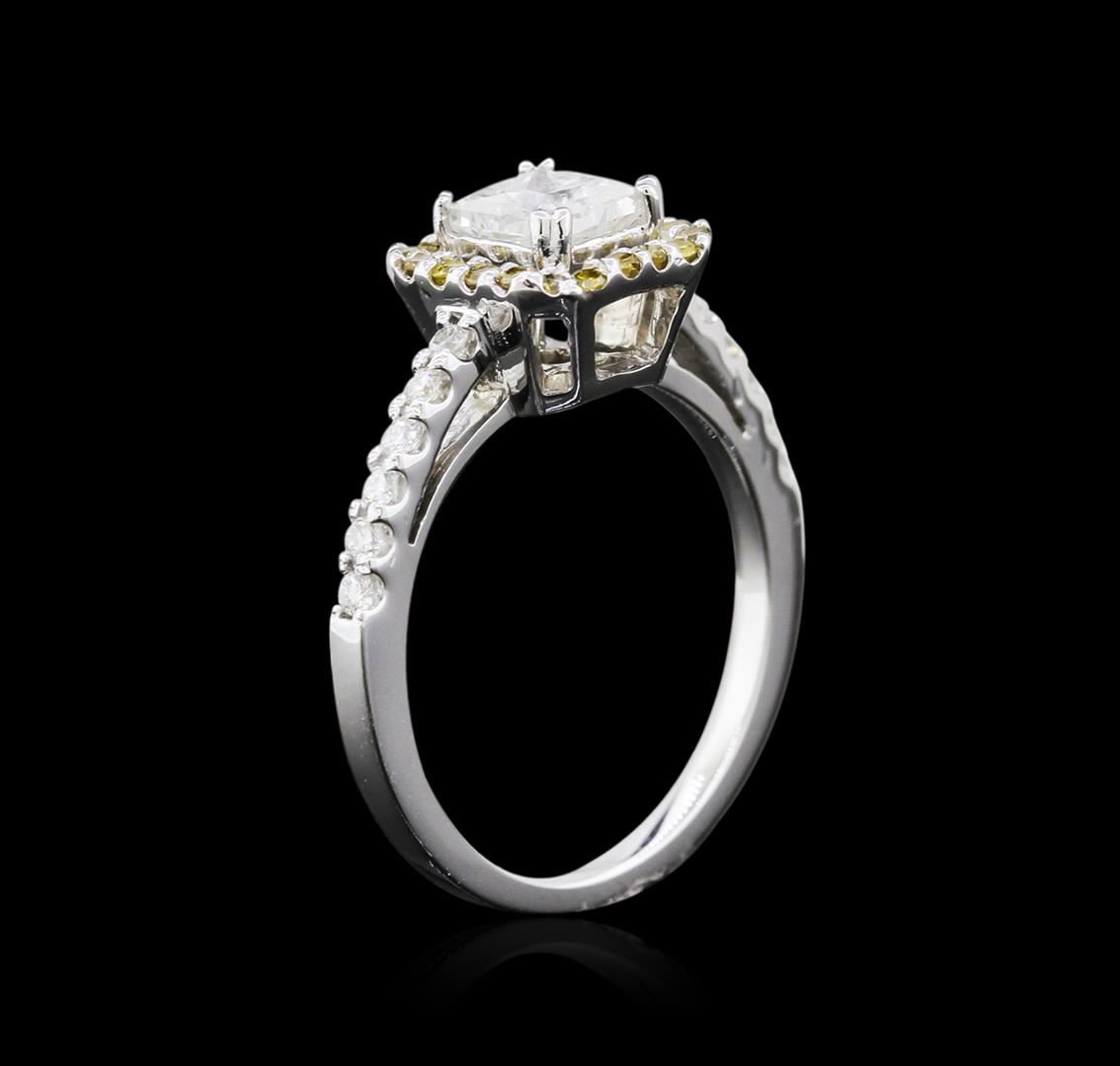 One electronically tested 14KT white gold ladies cast diamond ring with a bright polish finish. Identified with markings of "14K". Condition is new. Containing: One prong set princess cut diamond, measuring 5.20 x 5.20 x 3.90mm (depth est.) approximate weight of 0.82ct. Clarity: I-1. Color: I, Cut is Good. Twelve prong set round brilliant cut diamonds, measuring 1.60 - 1.60 x 0.96mm (depth est.) approximate total weight of 12 Stones = 0.18ct. Clarity: SI-2 to I-1. Color: H - I, Cut is Good. Twenty-One prong set single cut diamonds, measuring 1.30 - 1.30 x 0.78mm (depth est.) approximate total weight of 21 Stones = 0.26ct. Clarity: SI-2, Cut is Good. Color of the stones has been treated. Diamonds are graded in the mounting, unless otherwise stated. Total Weight of Diamonds 1.26ct. Total Weight of Ring 3.90 grams. GGL Appraised at $3,955.00.