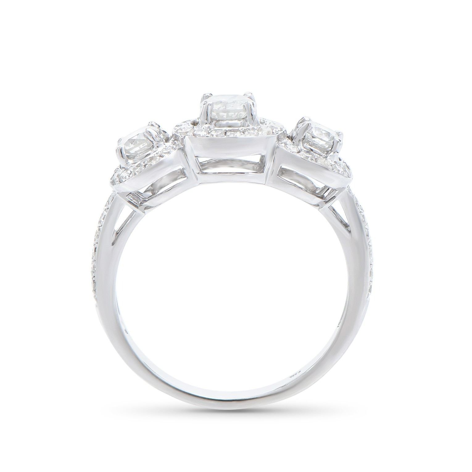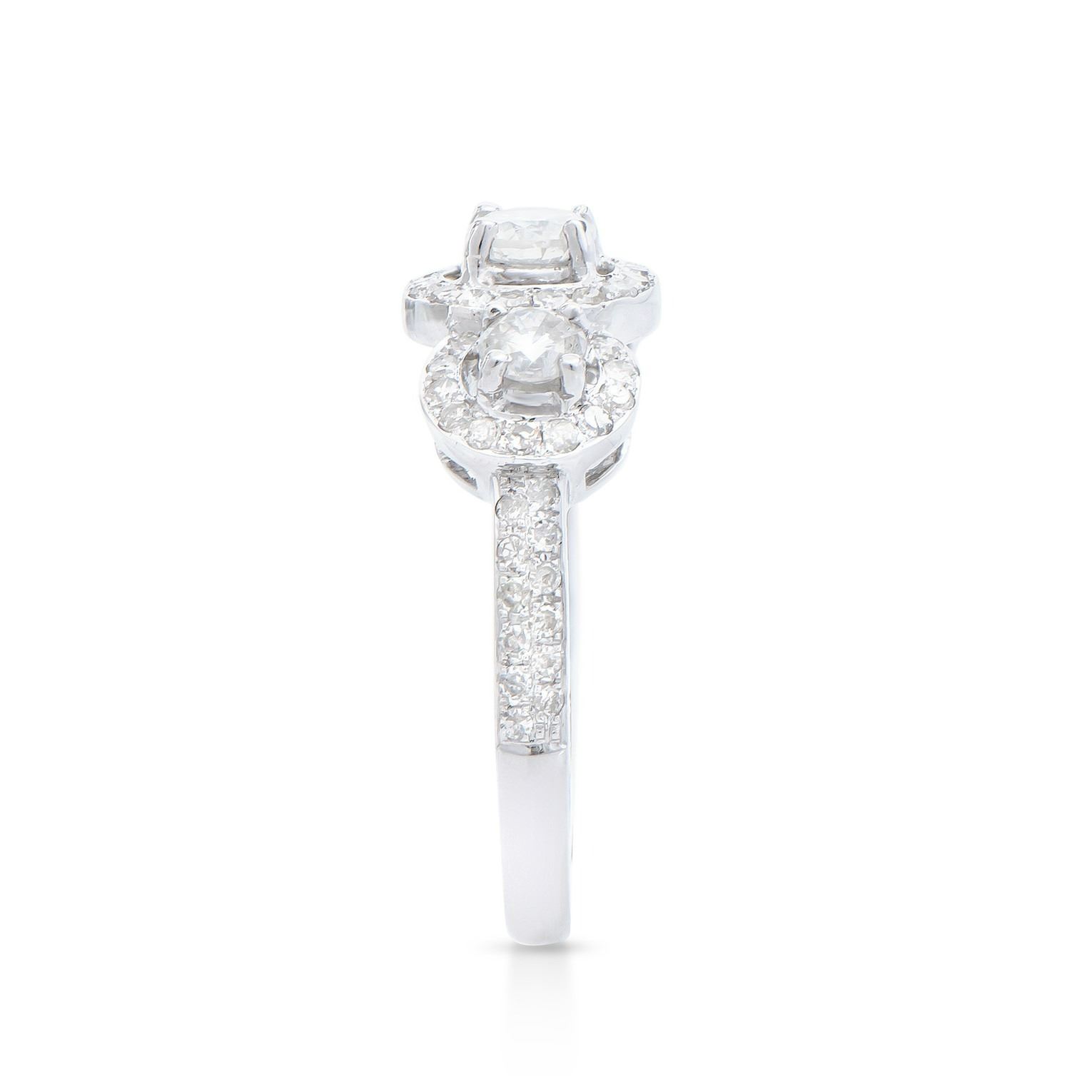 (3) round Diamonds with a total weight of 0.75cts with a color of H-I and clarity of I1-I2. (63) round Diamonds with a total weight of 0.51cts with a color of H-I and clarity of I1-I2. Total weight of this ring is 3.3 grams. Ring size is 7.5.