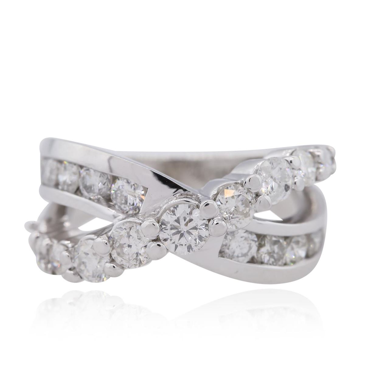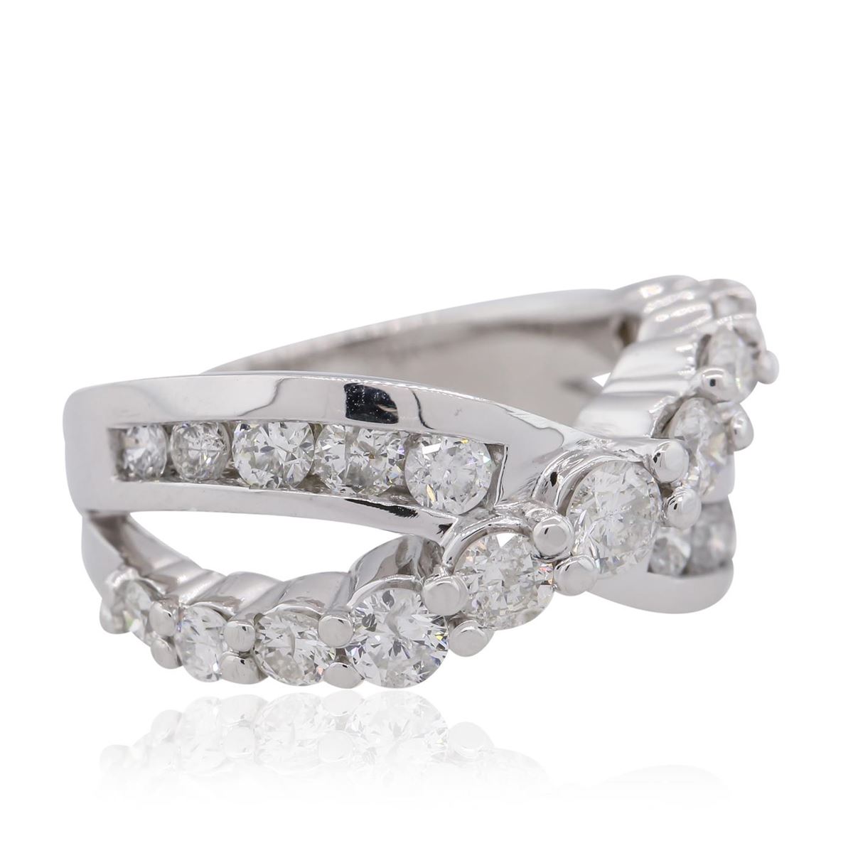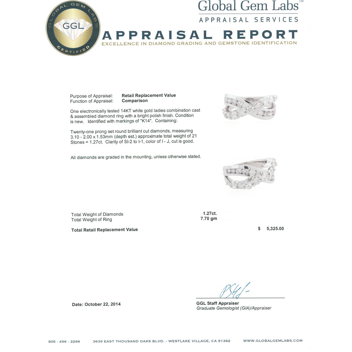 One electronically tested 14KT white gold ladies combination cast & assembled diamond ring with a bright polish finish. Identified with markings of "K14". Condition is new. Containing: Twenty-One prong set round brilliant cut diamonds, measuring 3.10 - 2.00 x 1.53mm (depth est.) approximate total weight of 21 Stones = 1.27ct. Clarity: SI-2 to I-1. Color: I - J, Cut is Good. All diamonds are graded in the mounting, unless otherwise stated. Total Weight of Diamonds 1.27ct. Total Weight of Ring 7.70 grams. GGL Appraised at $5,325.00.