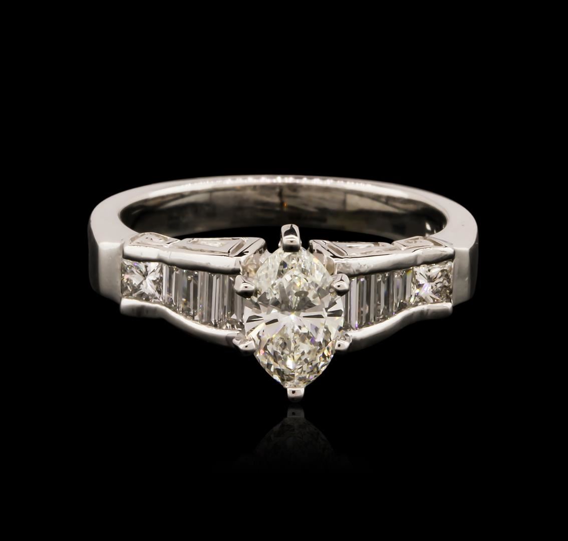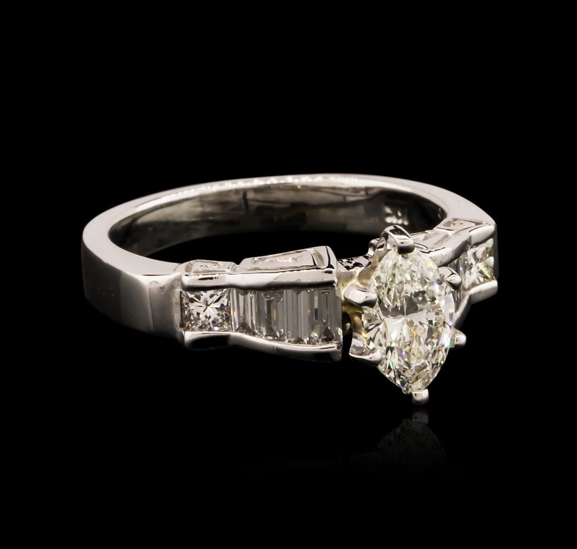 One electronically tested 14KT white gold ladies cast diamond engagement ring with a bright polish finish. Identified with markings of "14K". Condition is new. Containing: One prong set marquise shaped cut diamond, measuring 8.50 x 5.00 x 3.15mm (depth est.) approximate weight of 0.78ct. Clarity: SI-2. Color: K, Cut is Good. Two prong set princess cut diamonds, measuring 2.00 x 2.00 x 1.50mm (depth est.) approximate total weight of 2 Stones = 0.10ct. Clarity: SI-1. Color: J, Cut is Good. Eight channel set baguette cut diamonds, measuring 2.80 x 1.50 x 1.28mm (depth est.) approximate total weight of 8 Stones = 0.39ct. Clarity: VS-2. Color: I - J, Cut is Good. All diamonds are graded in the mounting, unless otherwise stated. Total Weight of Diamonds 1.27ct. Total Weight of Engagement Ring 5.20 grams. GGL Appraised at $6,420.00.