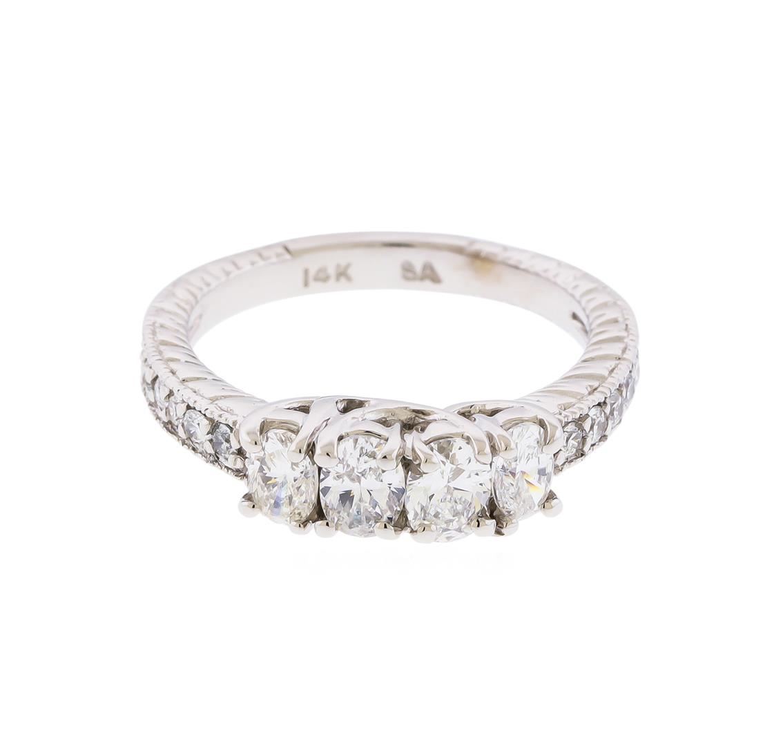 One electronically tested 14KT white gold ladies east diamond ring. Condition is new, good workmanship. The ring features a series of four oval shaped diamonds supported by round brilliant diamond set shoulders, completed by a patterned two and one-half millimeter wide band. Bright polish finish with milgrain detailing throughout. Identified with markings of" 14K". Containing: Two prong set oval shaped cut diamonds, measuring 4.80 x 3.80 x 2.39mm (depth est.) approximate total weight Of 2 Stones = 0.56ct. Graded in the setting. Clarity VS-2 to Sl-2, Color H -I. Two prong set oval shaped cut diamonds, measuring 4.50 x 3.30 x 2.08mm (depth est.) approximate total weight of 2 Stones 0.42Ct. Graded in the setting. Clarity VS-2 to SI-1, Color H-I. Ten bead set round brilliant cut diamonds, measuring 1.80 - 1.70 x I .05mm (depth est.) approximate total weight of 10 Stones = 0.29ct. Graded in the setting. Clarity Sl-1 to SI-2, and color H-J. The total weight of diamonds is 1.27ctw, and the total weight of the ring is 4.75 grams. AIG Appraised.
