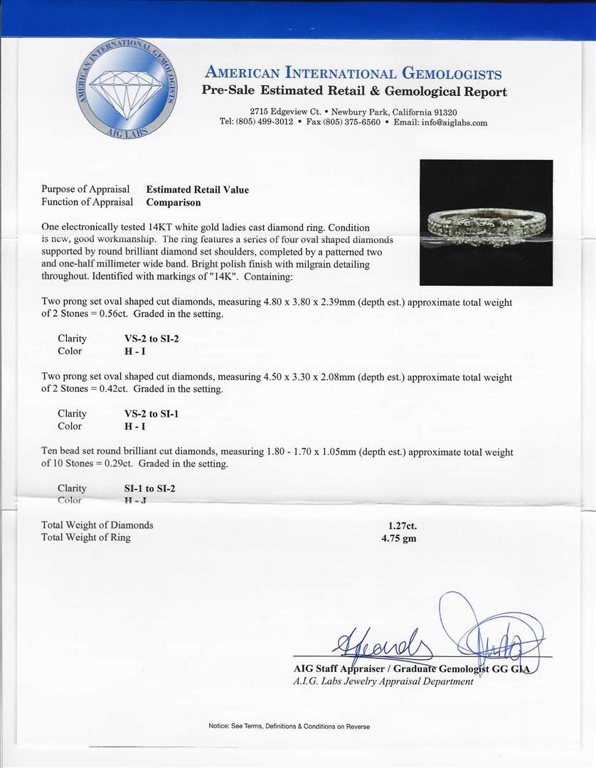 One electronically tested 14KT white gold ladies east diamond ring. Condition is new, good workmanship. The ring features a series of four oval shaped diamonds supported by round brilliant diamond set shoulders, completed by a patterned two and one-half millimeter wide band. Bright polish finish with milgrain detailing throughout. Identified with markings of" 14K". Containing: Two prong set oval shaped cut diamonds, measuring 4.80 x 3.80 x 2.39mm (depth est.) approximate total weight Of 2 Stones = 0.56ct. Graded in the setting. Clarity VS-2 to Sl-2, Color H -I. Two prong set oval shaped cut diamonds, measuring 4.50 x 3.30 x 2.08mm (depth est.) approximate total weight of 2 Stones 0.42Ct. Graded in the setting. Clarity VS-2 to SI-1, Color H-I. Ten bead set round brilliant cut diamonds, measuring 1.80 - 1.70 x I .05mm (depth est.) approximate total weight of 10 Stones = 0.29ct. Graded in the setting. Clarity Sl-1 to SI-2, and color H-J. The total weight of diamonds is 1.27ctw, and the total weight of the ring is 4.75 grams. AIG Appraised.
