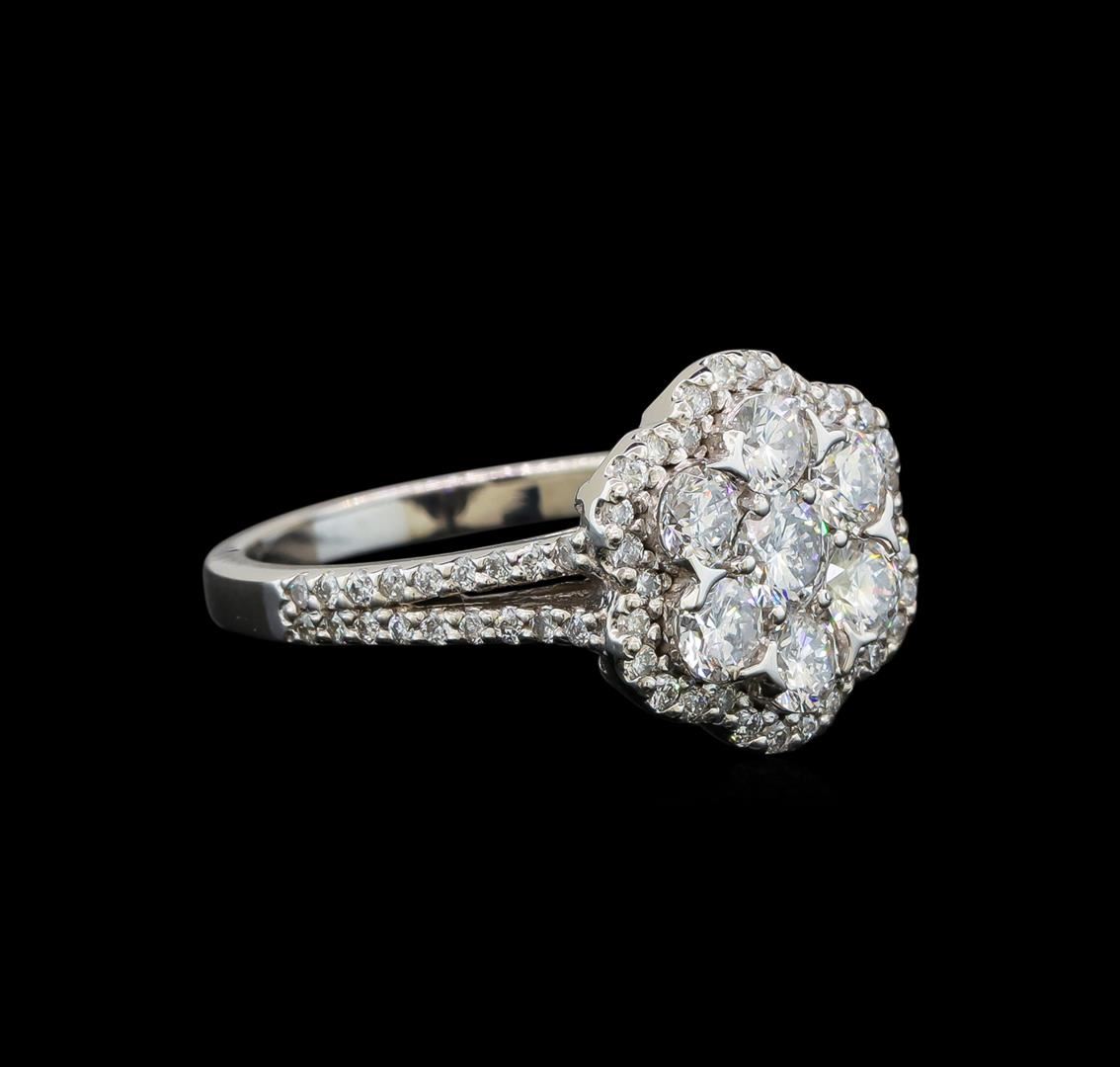 One electronically tested 14KT white gold ladies cast diamond ring with a bright polish finish. Identified with markings of "14K". Condition is new. Containing: One prong set round brilliant cut diamond, measuring 4.00 - 4.00 x 2.40mm (depth est.) approximate weight of 0.23ct. Clarity: SI-2. Color: I, Cut is Good. Seventy-One prong set round brilliant cut diamonds, measuring 2.80 - 1.10 x 1.17mm (depth est.) approximate total weight of 71 Stones = 1.04ct. Clarity: SI-1 to I-1. Color: I - J, Cut is Good. All diamonds are graded in the mounting, unless otherwise stated. Total Weight of Diamonds 1.27ct. Total Weight of Ring 4.50 grams. GGL Appraised at $3,450.00.