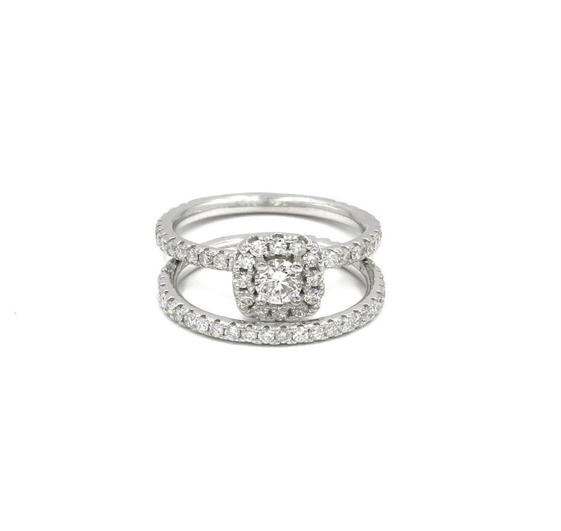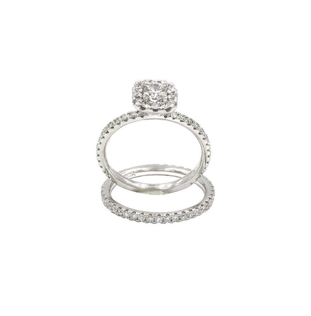 One Round Cut Diamond Halo Solitaire Band with Accent Ring in 14k White Gold. The ring setting style is solitaire with accents / band with diamonds. Condition is brand new. Total carat weight is 1.27 carats. Gross weight is 4.75 grams. Total stones is 74. Size 6 but can be resized free of charge. Main stone is natural and non-enhanced. Main diamond is 0.32 carats. Main diamond shape is brilliant round cut, clarity SI1, color G-H, and cut is very good. Side diamonds are natural and non-enhanced. Side diamonds are 0.95 carats, shape brilliant round cut, clarity SI-1, color G-H, and cut is very good with a total of 74 side diamonds.