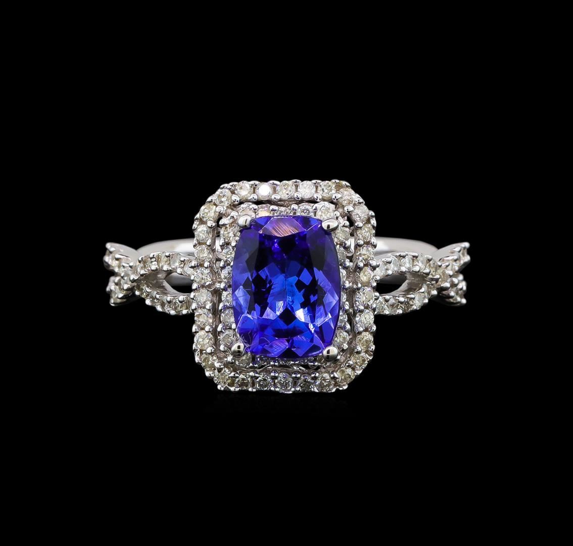 One electronically tested 14KT white gold ladies cast tanzanite and diamond ring with a half round shank with a bright polish finish. Trademark is Orianne. Identified with markings of "14K". Condition is new. Containing: One prong set rectangular cushion modified brilliant cut natural tanzanite, measuring 8.06 x 6.15 x 3.26mm, approximate weight of 1.27ct., clarity is eye clean, type I, medium light, very slightly grayish, violet color, (GIA V 4/3), cut is good. Ninety-Nine prong set round brilliant cut diamonds, measuring 1.00 - 1.00 x 0.60mm (depth est.) approximate total weight of 99 Stones = 0.36ct. Clarity: I-1 to I-2. Color: I - J. All diamonds and colored gemstones are graded in the mounting, unless otherwise stated. Colored gemstones are presumed to have been subjected to commonly used enhancement processes. Total Weight of Colored Stones 1.27ct. Total Weight of Diamonds 0.36ct. Total Weight of Ring 3.80 grams. GGL Appraised at $3,150.00.