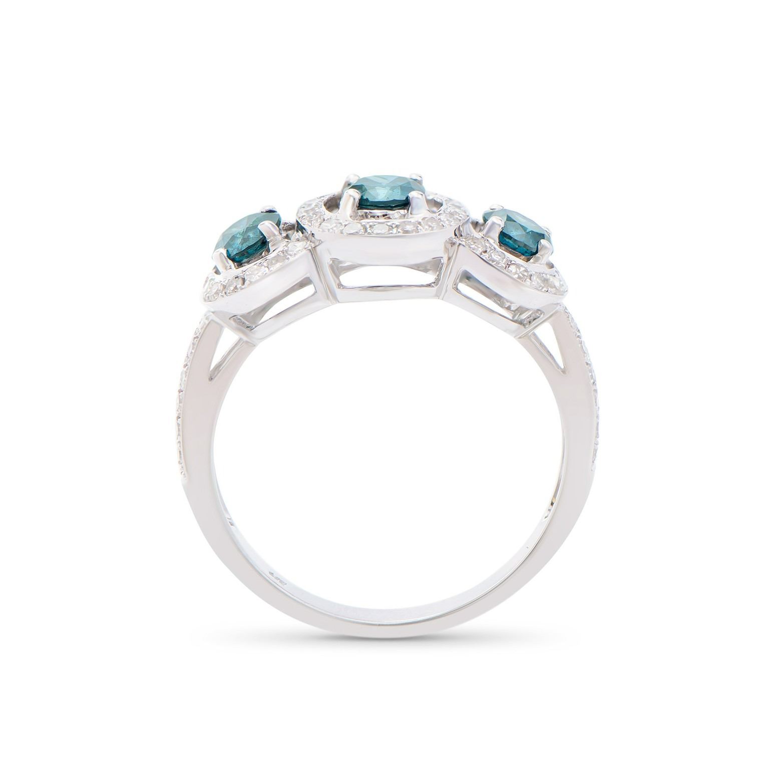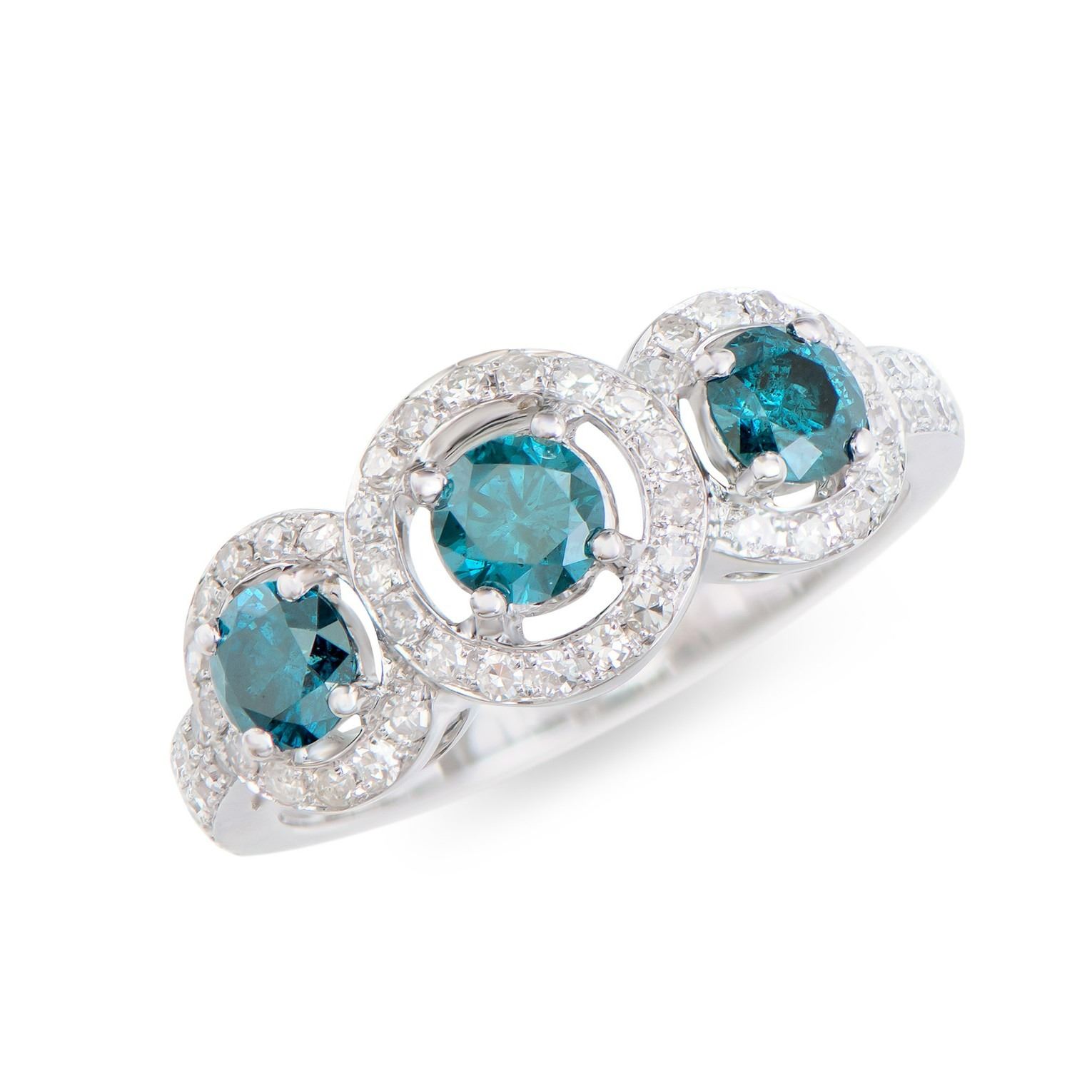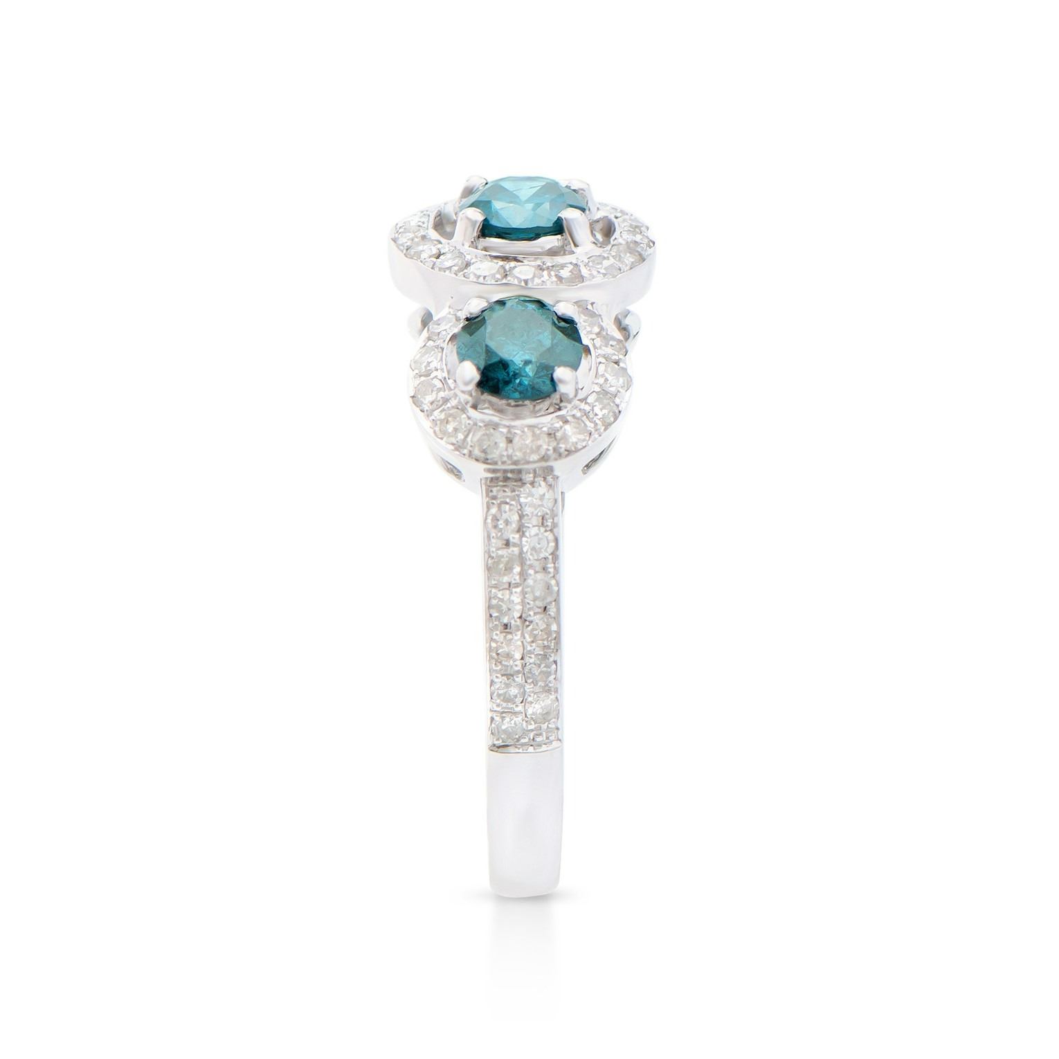 (3) round dark Blue Diamonds with a total weight of 0.85cts with a color of Dark Blue and clarity of I1-I2. (63) round Diamonds with a total weight of 0.42cts with a color of H-I and clarity of I1-I2. Total weight of this ring is 3.15 grams. Ring size is 7.5.