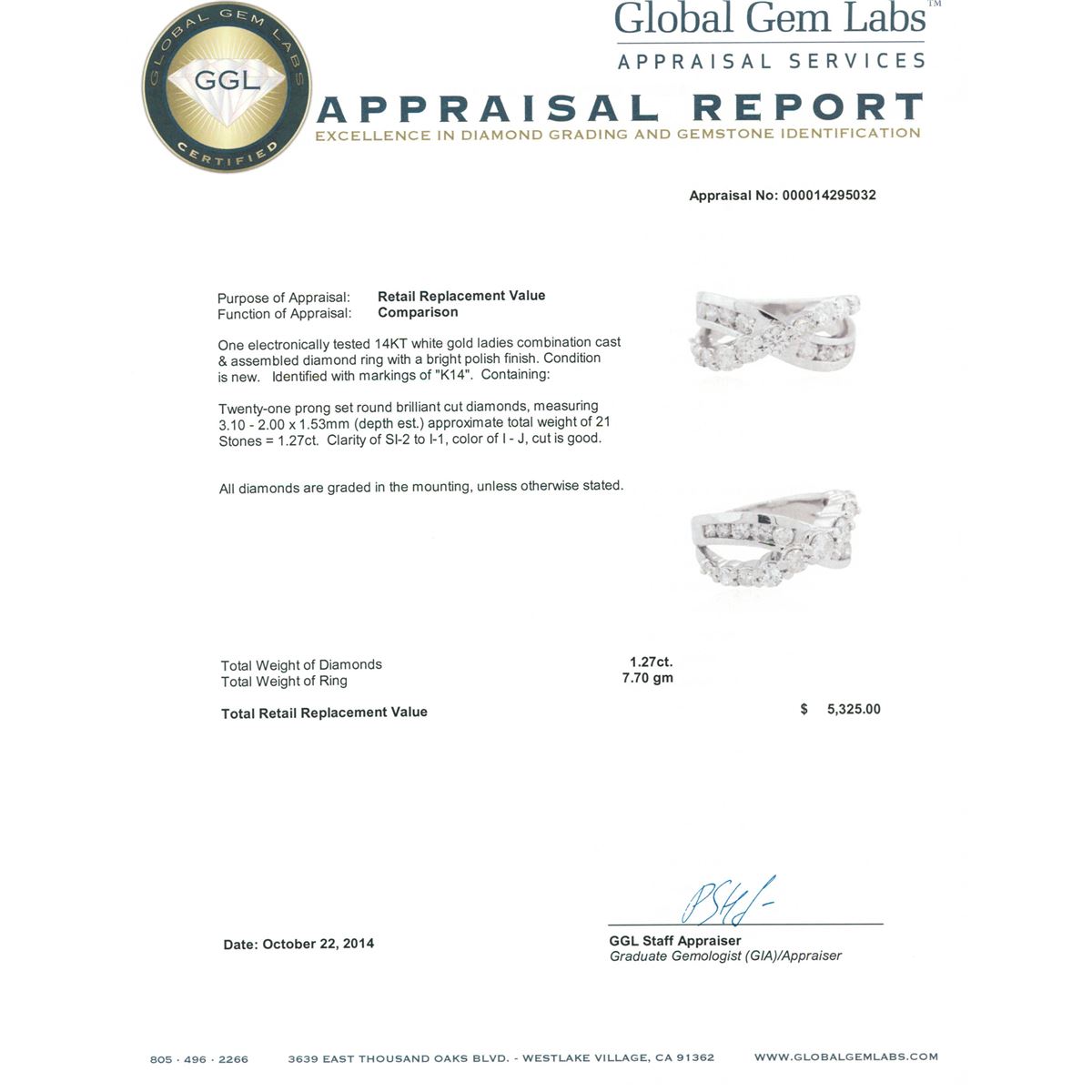 One electronically tested 14KT white gold ladies combination cast & assembled diamond ring with a bright polish finish. Identified with markings of "K14". Condition is new. Containing: Twenty-One prong set round brilliant cut diamonds, measuring 3.10 - 2.00 x 1.53mm (depth est.) approximate total weight of 21 Stones = 1.27ct. Clarity: SI-2 to I-1. Color: I - J, Cut is Good. All diamonds are graded in the mounting, unless otherwise stated. Total Weight of Diamonds 1.27ct. Total Weight of Ring 7.70 grams. GGL Appraised at $5,325.00.