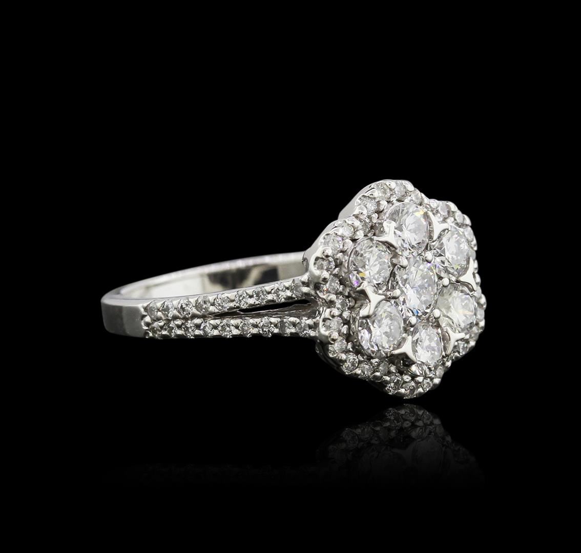 One electronically tested 14KT white gold ladies cast diamond ring with a bright polish finish. Identified with markings of "14K". Condition is new. Containing: One prong set round brilliant cut diamond, measuring 4.00 - 4.00 x 2.40mm (depth est.) approximate weight of 0.23ct. Clarity: SI-2. Color: I, Cut is Good. Seventy-One prong set round brilliant cut diamonds, measuring 2.80 - 1.10 x 1.17mm (depth est.) approximate total weight of 71 Stones = 1.04ct. Clarity: SI-1 to I-1. Color: I - J, Cut is Good. All diamonds are graded in the mounting, unless otherwise stated. Total Weight of Diamonds 1.27ct. Total Weight of Ring 4.50 grams. GGL Appraised at $3,450.00.