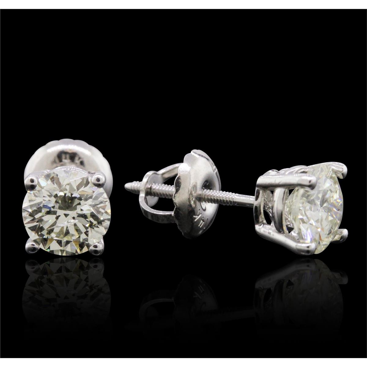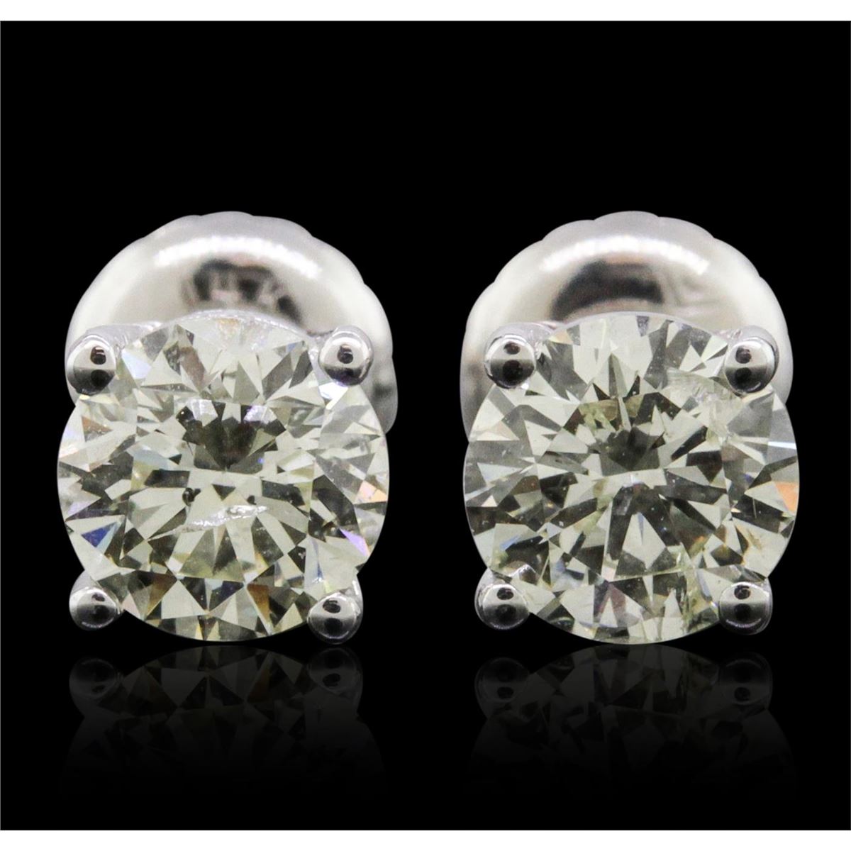 One pair electronically tested 14KT white gold cast & assembled diamond solitaire earrings with screw backs. Bright polish finish. Condition is new, good workmanship. Containing: One prong set round brilliant cut diamond, measuring 5.21 - 5.20 x 3.20mm (depth est.), 3.00% GTCF approximate weight of 0.64ct with a medium blue fluorescence. Graded in the setting. Clarity: I-1. Depth: 61.4%. Table 60.5%. One prong set round brilliant cut diamond, measuring 5.14 - 5.13 x 3.30mm (depth est.), 3.00% GTCF approximate weight of 0.64ct with a faint blue fluorescence. Graded in the setting. Clarity: I-1. Depth: 64.2%. Table 60.3%. Total Weight of Diamonds 1.28ct. Total Weight of Earrings 0.96 grams. AIG Appraised at $4,150.00.