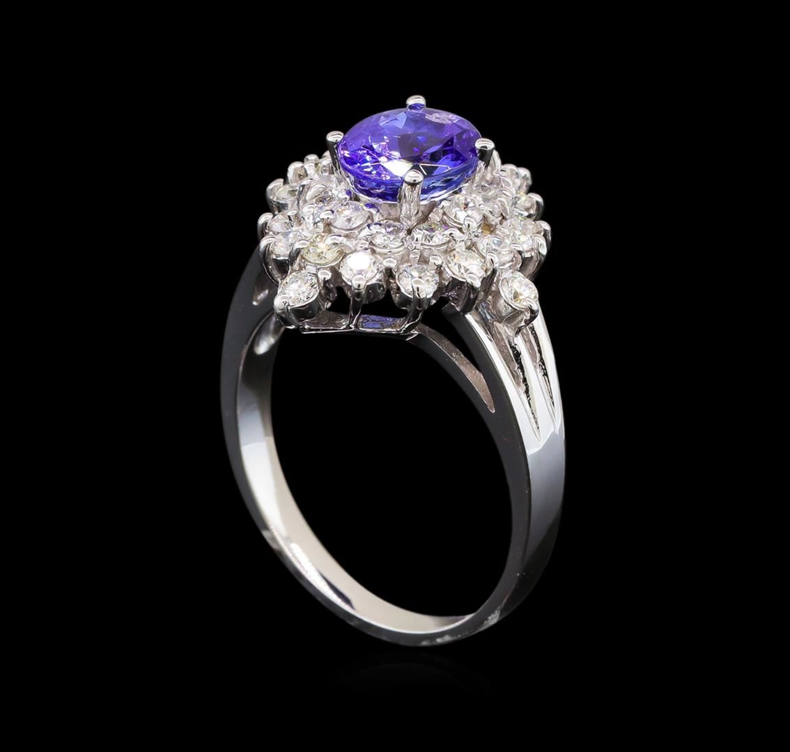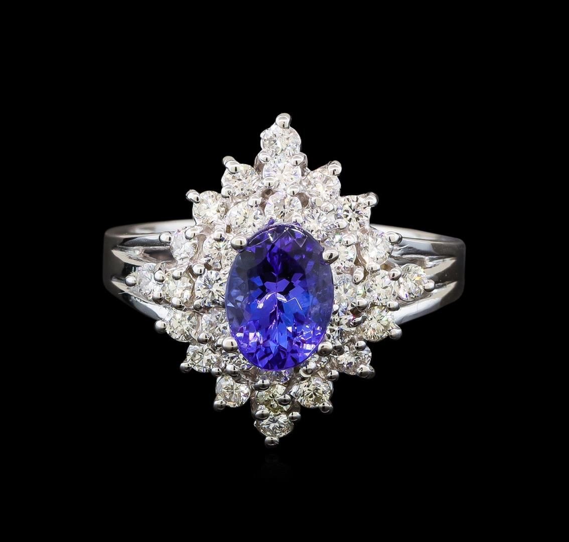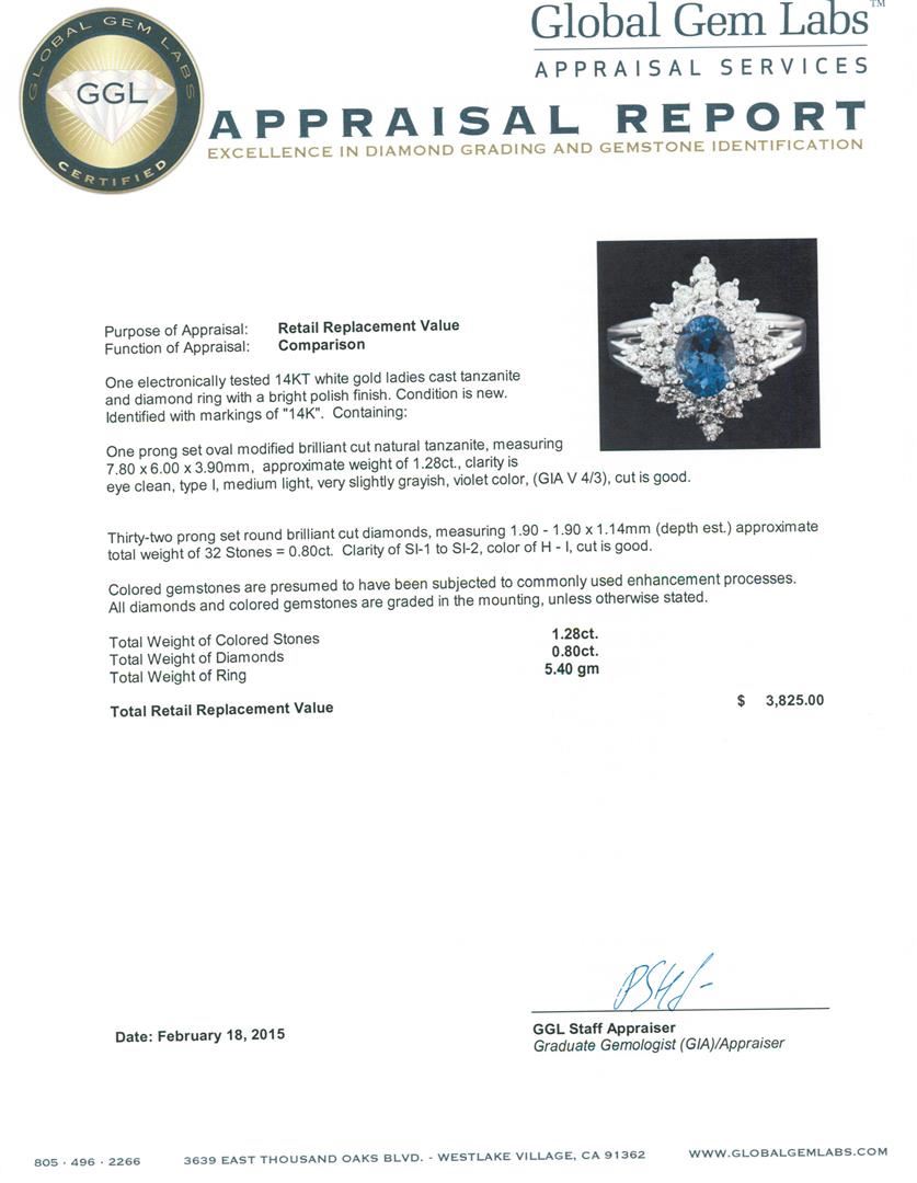 One electronically tested 14KT white gold ladies cast tanzanite and diamond ring with a bright polish finish. Identified with markings of "14K". Condition is new. Containing: One prong set oval modified brilliant cut natural tanzanite, measuring 7.80 x 6.00 x 3.90mm, approximate weight of 1.28ct., clarity is eye clean, type I, medium light, very slightly grayish, violet color, (GIA V 4/3), cut is good. Thirty-Two prong set round brilliant cut diamonds, measuring 1.90 - 1.90 x 1.14mm (depth est.) approximate total weight of 32 Stones = 0.80ct. Clarity: SI-1 to SI-2. Color: H - I, Cut is Good. Colored gemstones are presumed to have been subjected to commonly used enhancement processes. All diamonds and colored gemstones are graded in the mounting, unless otherwise stated. Total Weight of Colored Stones 1.28ct. Total Weight of Diamonds 0.80ct. Total Weight of Ring 5.40 grams. GGL Appraised at $3,825.00.