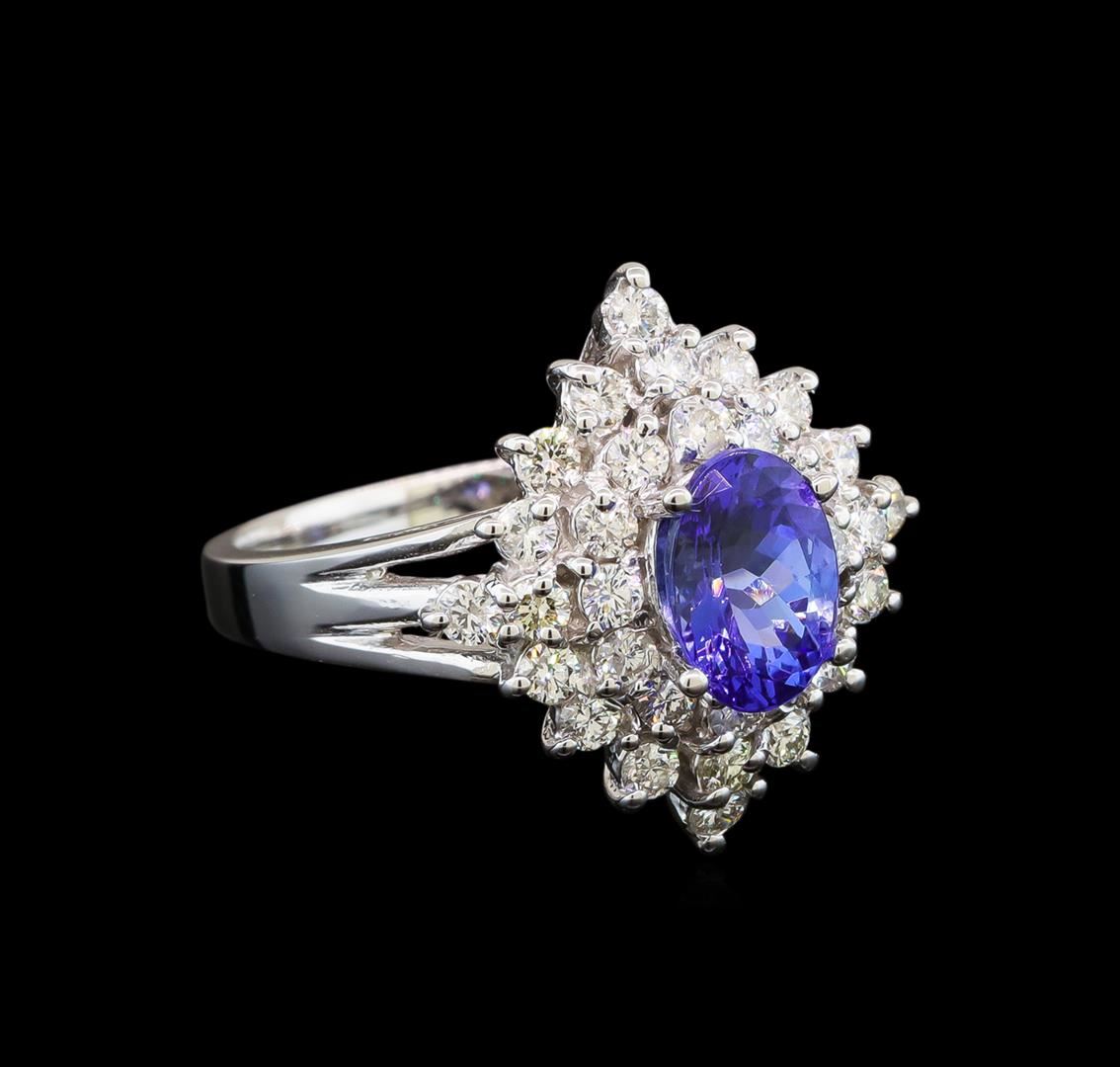 One electronically tested 14KT white gold ladies cast tanzanite and diamond ring with a bright polish finish. Identified with markings of "14K". Condition is new. Containing: One prong set oval modified brilliant cut natural tanzanite, measuring 7.80 x 6.00 x 3.90mm, approximate weight of 1.28ct., clarity is eye clean, type I, medium light, very slightly grayish, violet color, (GIA V 4/3), cut is good. Thirty-Two prong set round brilliant cut diamonds, measuring 1.90 - 1.90 x 1.14mm (depth est.) approximate total weight of 32 Stones = 0.80ct. Clarity: SI-1 to SI-2. Color: H - I, Cut is Good. Colored gemstones are presumed to have been subjected to commonly used enhancement processes. All diamonds and colored gemstones are graded in the mounting, unless otherwise stated. Total Weight of Colored Stones 1.28ct. Total Weight of Diamonds 0.80ct. Total Weight of Ring 5.40 grams. GGL Appraised at $3,825.00.