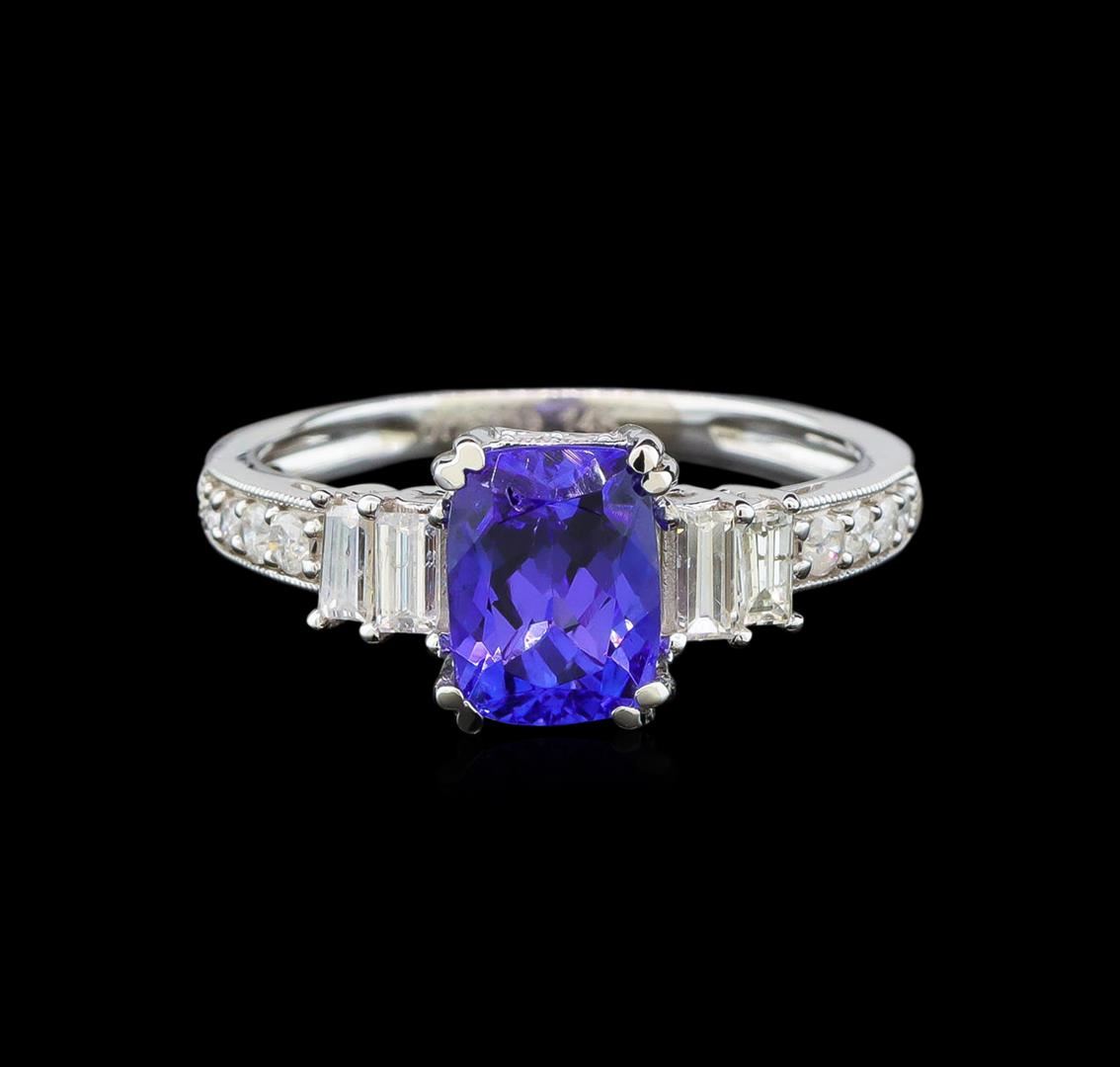 One electronically tested 14KT white gold ladies cast tanzanite and diamond ring with a bright polish finish. Identified with markings of "14K". Condition is new. Containing: One prong set rectangular cushion modified brilliant cut natural tanzanite, measuring 7.92 x 5.90 x 3.48mm, approximate weight of 1.28ct., clarity is eye clean, type I, medium light, very slightly grayish, violet color, (GIA V 4/3), cut is good. Eight prong set round brilliant cut diamonds, measuring 1.50 - 1.50 x 0.90mm (depth est.) approximate total weight of 8 Stones = 0.10ct. Clarity: I-1 to I-2. Color: I - J. Four prong set baguette cut diamonds, measuring 3.50 x 1.50 x 1.28mm (depth est.) approximate total weight of 4 Stones = 0.25ct. Clarity: SI-1 to SI-2. Color: H - I, Cut is Good. Colored gemstones are presumed to have been subjected to commonly used enhancement processes. All diamonds and colored gemstones are graded in the mounting, unless otherwise stated. Total Weight of Colored Stones 1.28ct. Total Weight of Diamonds 0.34ct. Total Weight of Ring 3.20 grams. GGL Appraised at $2,725.00.