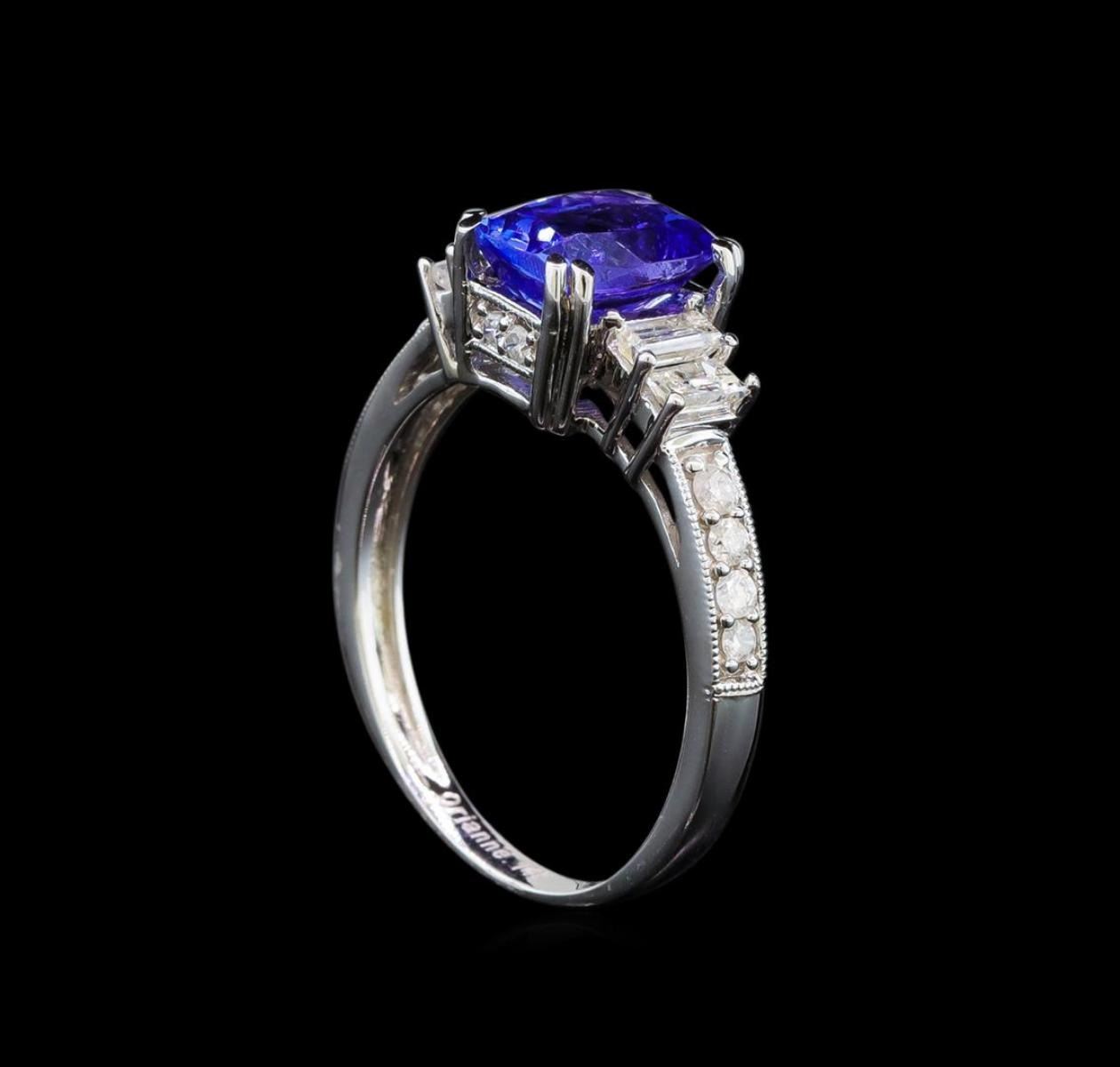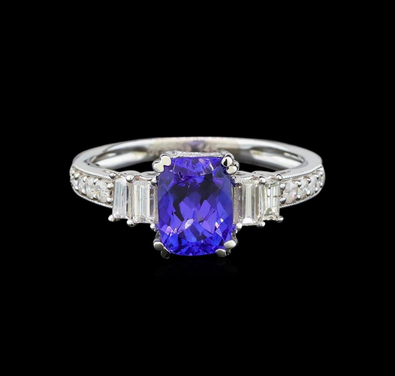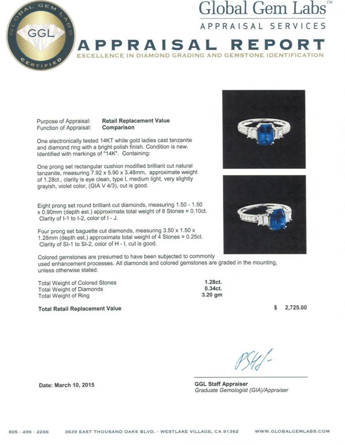 One electronically tested 14KT white gold ladies cast tanzanite and diamond ring with a bright polish finish. Identified with markings of "14K". Condition is new. Containing: One prong set rectangular cushion modified brilliant cut natural tanzanite, measuring 7.92 x 5.90 x 3.48mm, approximate weight of 1.28ct., clarity is eye clean, type I, medium light, very slightly grayish, violet color, (GIA V 4/3), cut is good. Eight prong set round brilliant cut diamonds, measuring 1.50 - 1.50 x 0.90mm (depth est.) approximate total weight of 8 Stones = 0.10ct. Clarity: I-1 to I-2. Color: I - J. Four prong set baguette cut diamonds, measuring 3.50 x 1.50 x 1.28mm (depth est.) approximate total weight of 4 Stones = 0.25ct. Clarity: SI-1 to SI-2. Color: H - I, Cut is Good. Colored gemstones are presumed to have been subjected to commonly used enhancement processes. All diamonds and colored gemstones are graded in the mounting, unless otherwise stated. Total Weight of Colored Stones 1.28ct. Total Weight of Diamonds 0.34ct. Total Weight of Ring 3.20 grams. GGL Appraised.