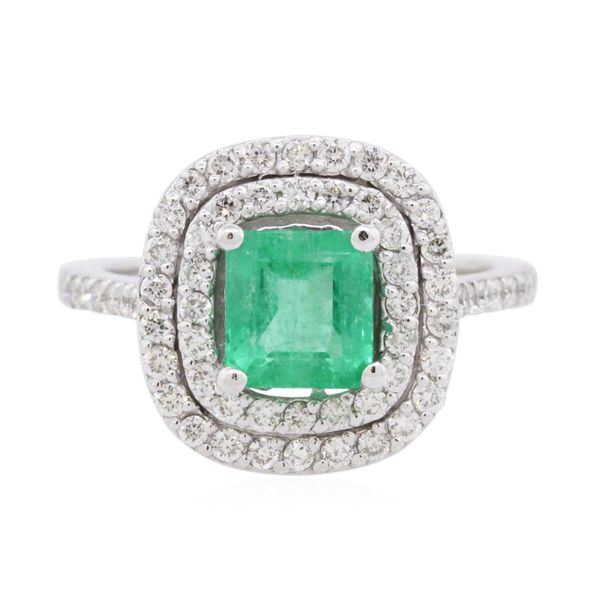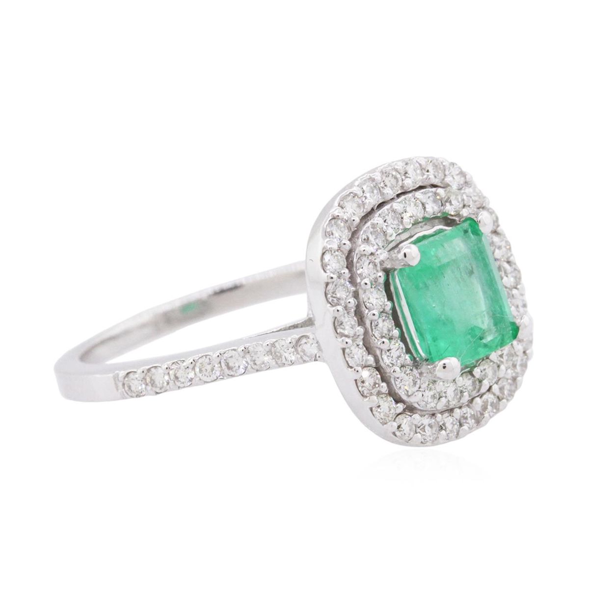 One electronically tested 14KT white gold ladies cast emerald and diamond ring with a bright polish finish. The featured emerald is set within two tiered diamond bezel supported by diamond set shoulders, completed by one and one-half millimeter wide band. Condition is new, good workmanship. Containing: One prong set rectangular step cut natural emerald, measuring 6.35 x 5.90 x 3.95mm, 6% bulge factor, approximate weight of 1.28ct., clarity is heavily included, type III, medium dark, very slightly grayish, very slightly bluish green color, (GIA vslbG 6/3), cut is good. Transmitting light with a minimum of distortion, transparent. Naturally occurring internal & external characteristics are present. Indications of multiple laboratory enhancements, including oil residue. Graded in the setting. Sixty-Two prong set round brilliant cut diamonds, measuring 1.50 - 1.40 x 0.87mm (depth est.) approximate total weight of 62 Stones = 0.78ct. Graded in the setting. Clarity: SI-1 to I-1. Color: G - I. Total Weight of Colored Stones 1.28ct. Total Weight of Diamonds 0.78ct. Total Weight of Ring 4.61 grams. AIG Appraised at $4,540.00.