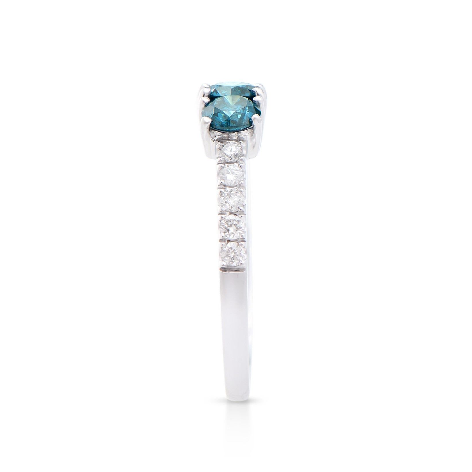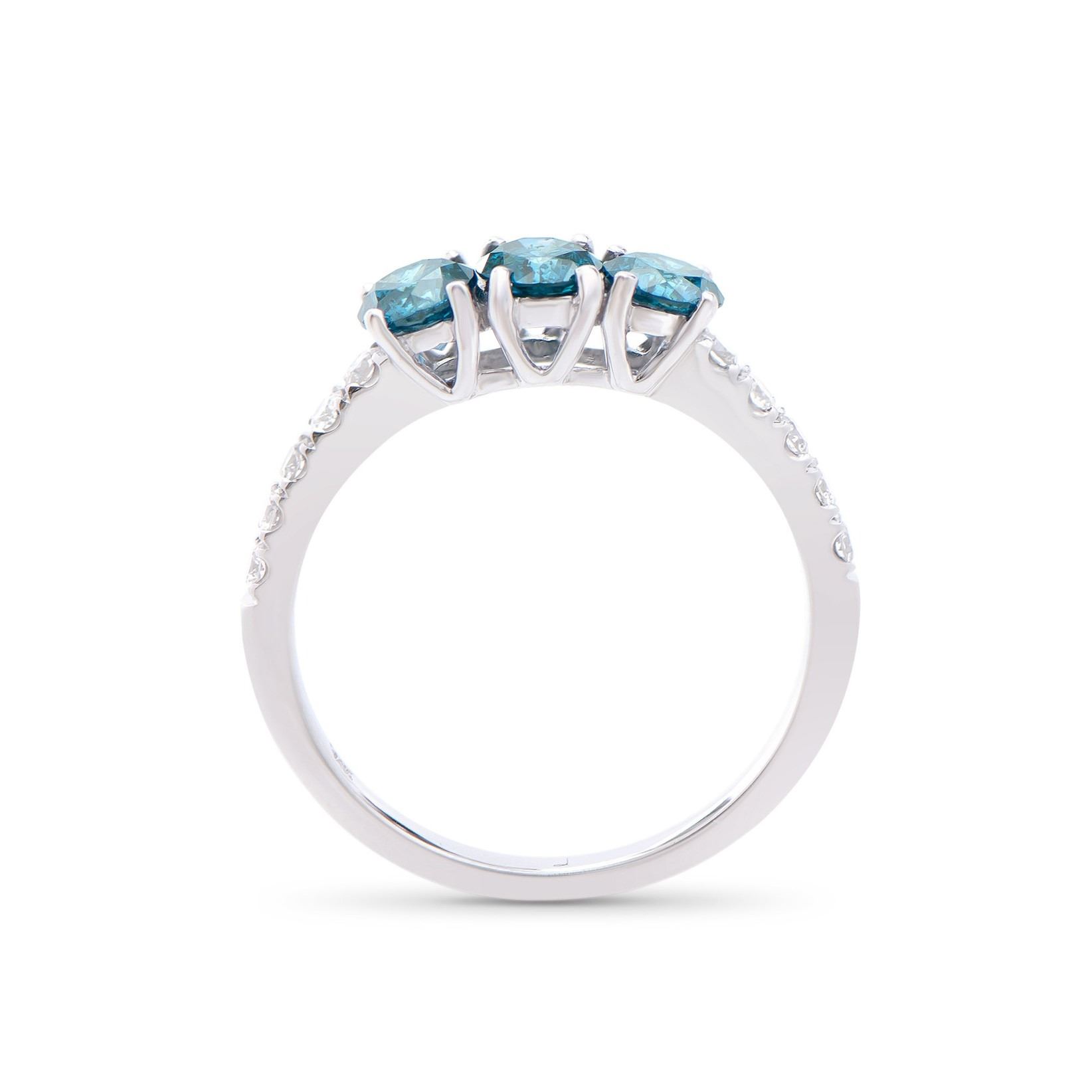 (3) round dark Blue Diamonds with a total weight of 1.02cts with a color of Dark Blue and clarity of I1-I2. (10) round Diamonds with a total weight of 0.26cts with a color of H-I and clarity of I1-I2. Total weight of this ring is 2.25 grams. Ring size is 7.5.