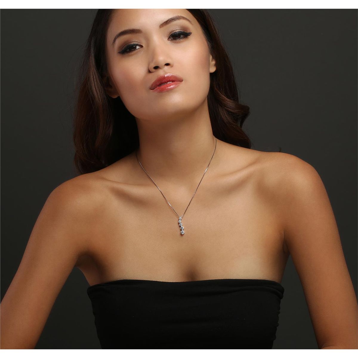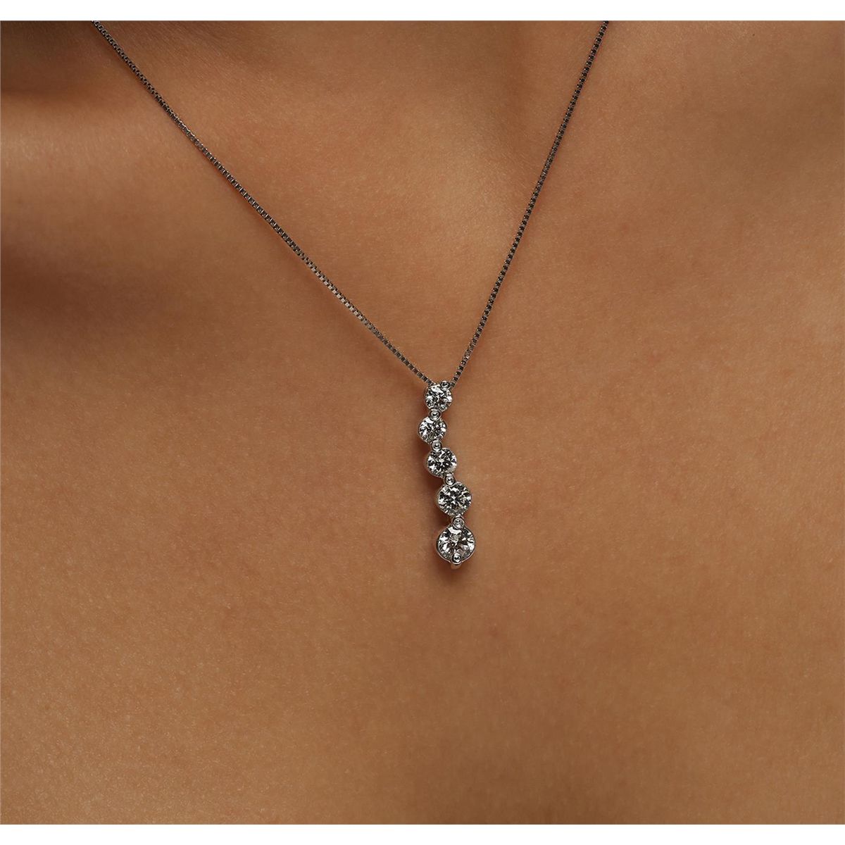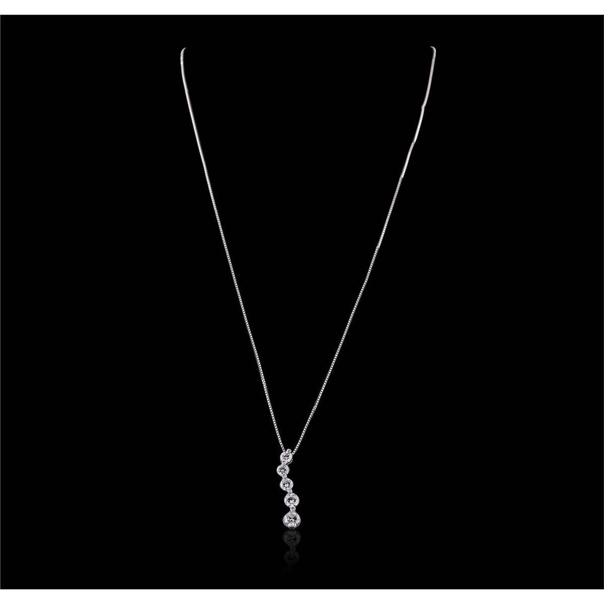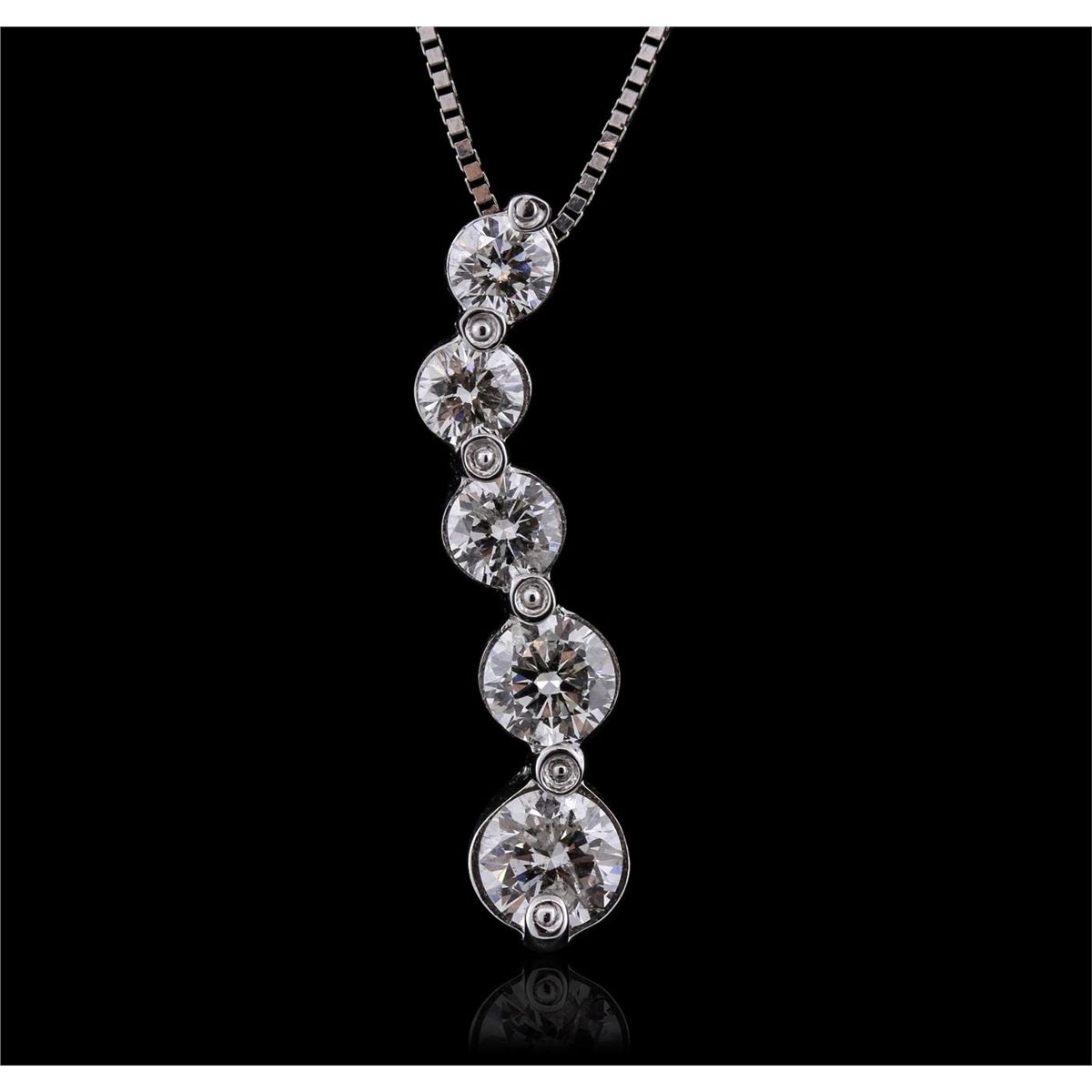 One electronically tested 14KT white gold ladies combination cast & assembled pendant & chain 16.0" long, light box link with a spring ring clasp with a bright polish finish. Condition is new. Identified with markings of "14K". Containing: One prong set round brilliant cut diamond, measuring 5.00 - 5.00 x 3.00mm (depth est.) approximate weight of 0.46ct. Clarity: I-1. Color: J, Cut is Good. One prong set round brilliant cut diamond, measuring 4.30 - 4.30 x 2.58mm (depth est.) approximate weight of 0.29ct. Clarity: SI-1. Color: J, Cut is Good. Three prong set round brilliant cut diamonds, measuring 3.80 - 3.50 x 2.19mm (depth est.) approximate. Total Weight of 3 Stones = 0.53ct. Clarity: SI-1 to SI-2. Color: J, Cut is Good. All diamonds are graded in the mounting, unless otherwise stated. Total Weight of Diamonds 1.28ct. Total Weight of Pendant & Chain 3.80 grams. GGL Appraised at $5,660.00.