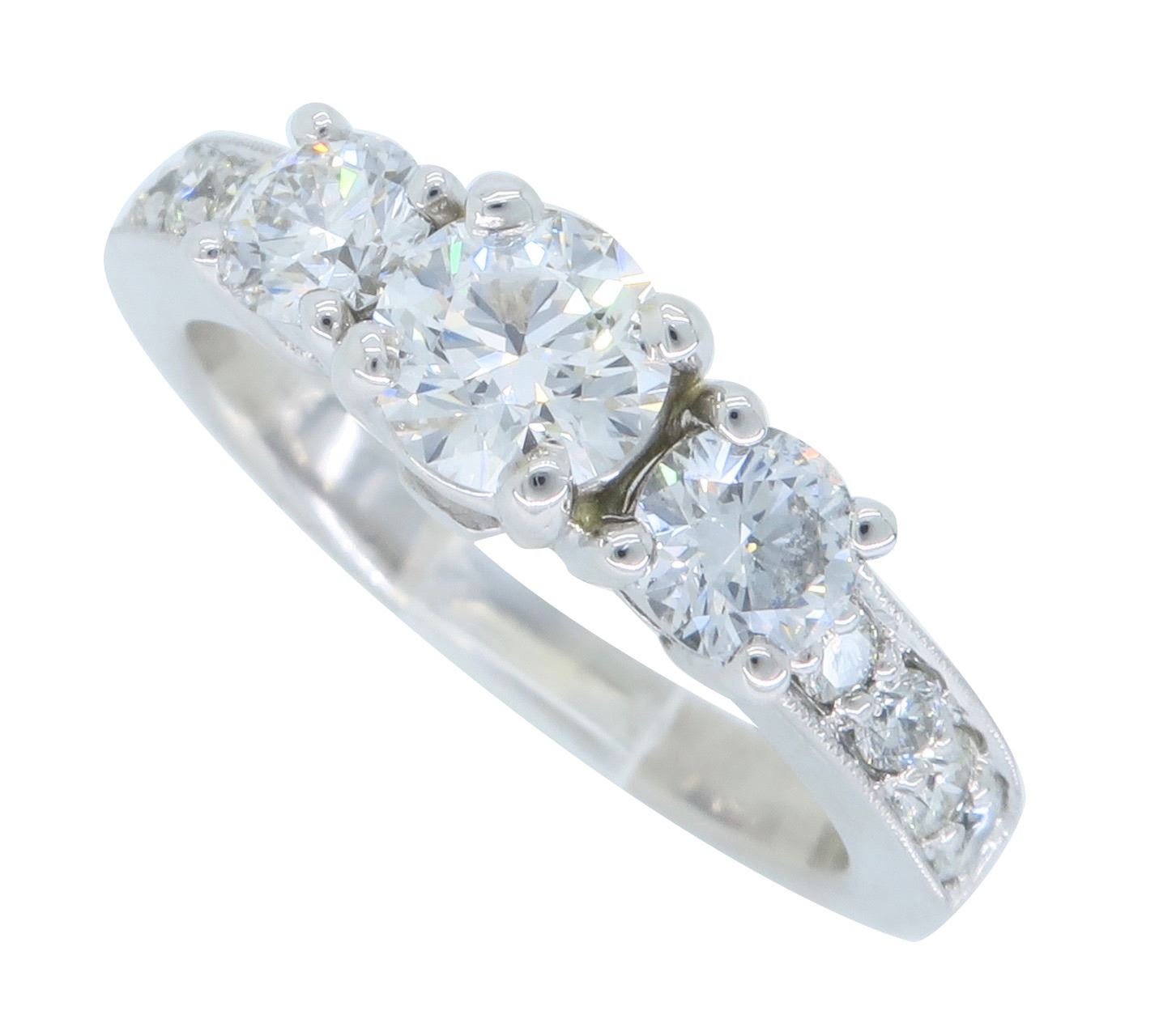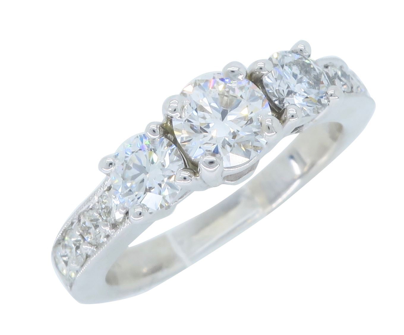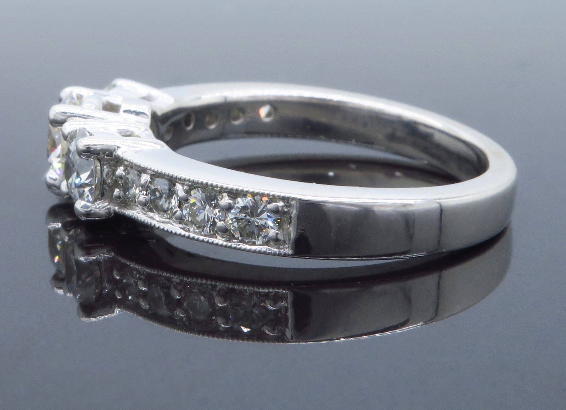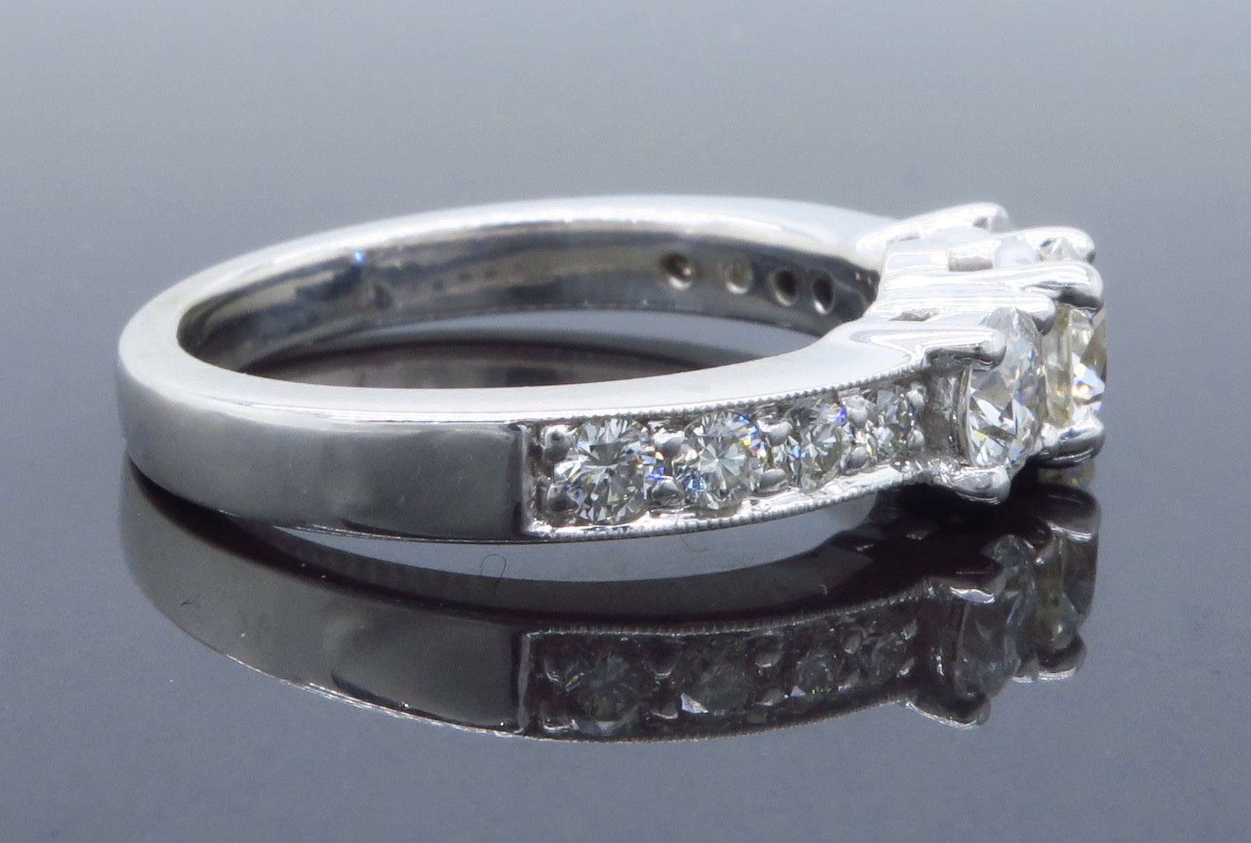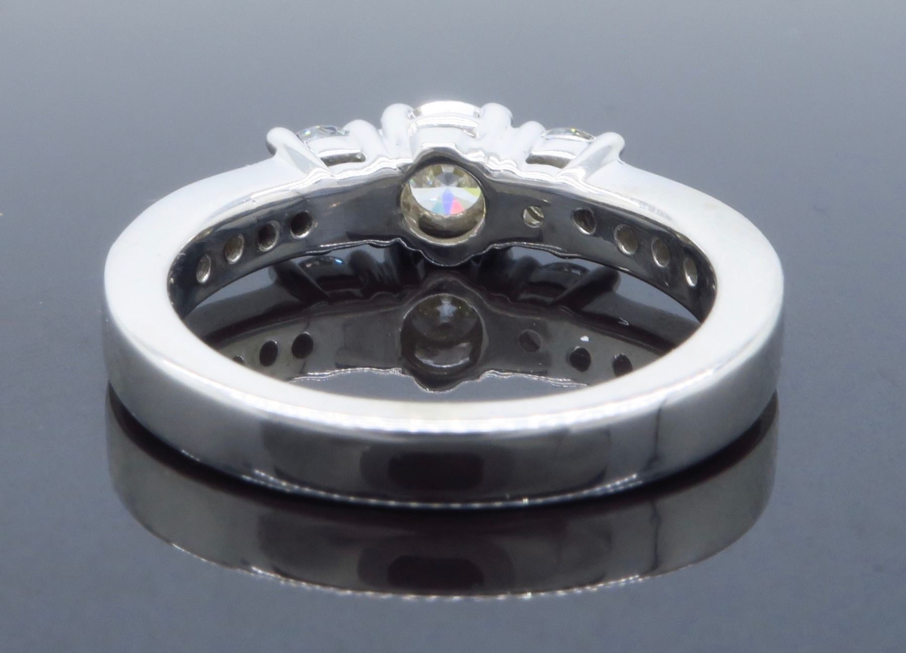 One 14KT White Gold 1.28ctw Diamond Ring. (1) Round center Diamond with a total weight of 0.50cts with a color of H-I and clarity of VS-2. (2) Side round side diamonds each weighing 0.21cts. Side round diamonds with a total weight of 0.36cts. Total weight of this ring is 5.2 grams. Ring size is 6.25.