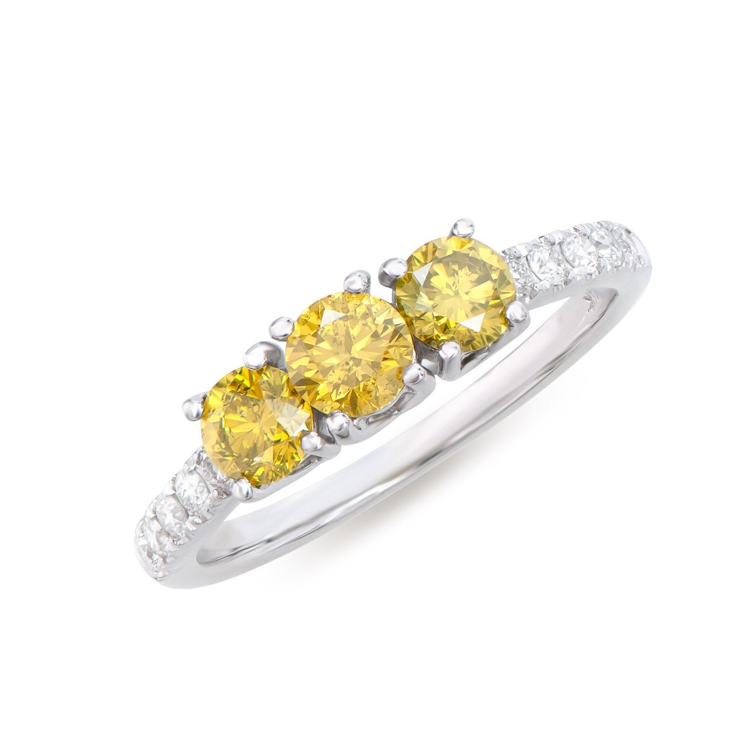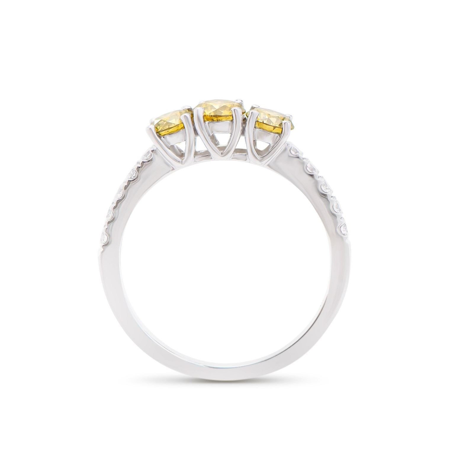 (3) round Yellow Diamonds with a total weight of 1.02cts with a color of Yellow and clarity of I1-I2. (10) round Diamonds with a total weight of 0.26cts with a color of H-I and clarity of I1-I2. Total weight of this ring is 2.25 grams. Ring size is 7.5.