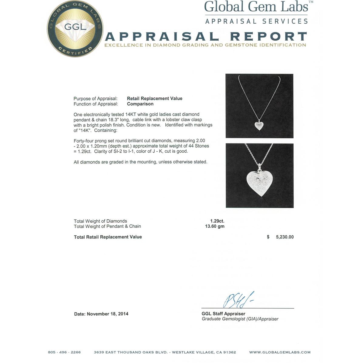One electronically tested 14KT white gold ladies cast diamond pendant & chain 18.3" long, cable link with a lobster claw clasp with a bright polish finish. Identified with markings of "14K". Condition is new. Containing: Forty-Four prong set round brilliant cut diamonds, measuring 2.00 - 2.00 x 1.20mm (depth est.) approximate total weight of 44 Stones = 1.29ct. Clarity: SI-2 to I-1. Color: J - K, Cut is Good. All diamonds are graded in the mounting, unless otherwise stated. Total Weight of Diamonds 1.29ct. Total Weight of Pendant & Chain 13.60 grams. GGL Appraised at $5,230.00.