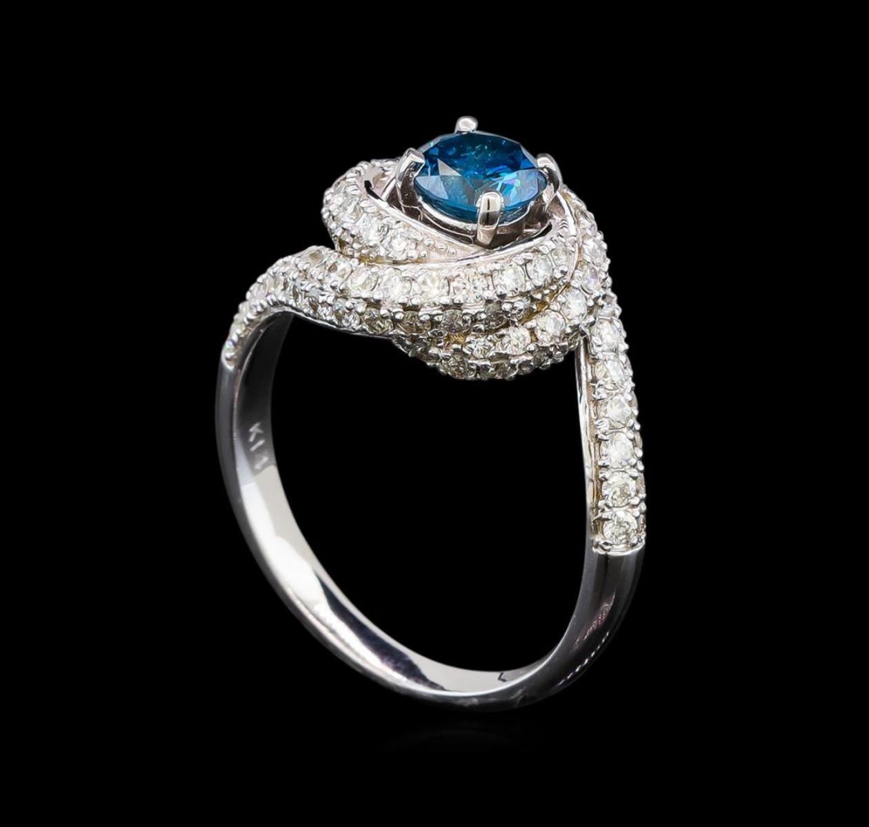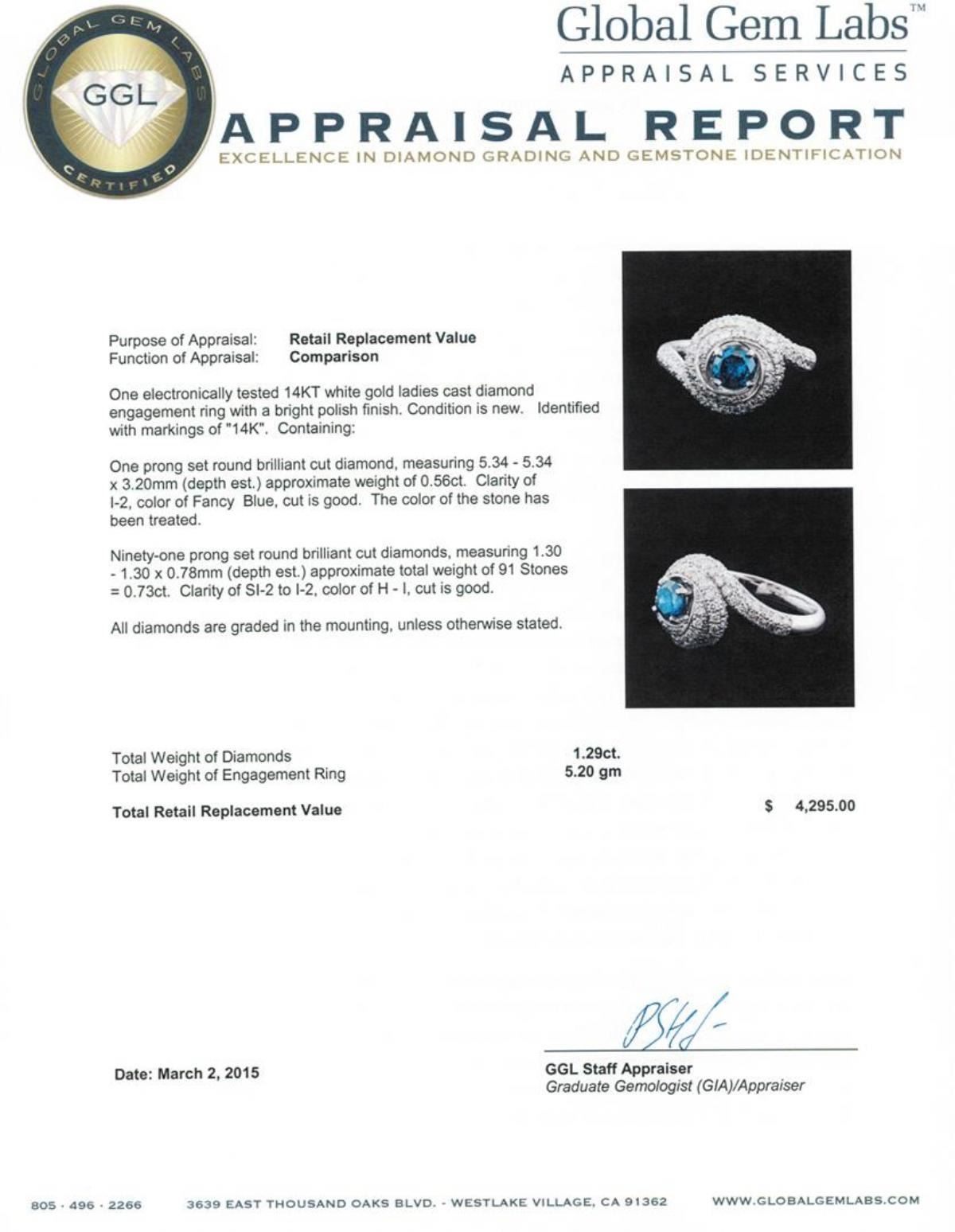 One electronically tested 14KT white gold ladies cast diamond engagement ring with a bright polish finish. Identified with markings of "14K". Condition is new. Containing: One prong set round brilliant cut diamond, measuring 5.34 - 5.34 x 3.20mm (depth est.) approximate weight of 0.56ct. Clarity: I-2, Cut is Good. The color of the stone has been treated. Ninety-One prong set round brilliant cut diamonds, measuring 1.30 - 1.30 x 0.78mm (depth est.) approximate total weight of 91 Stones = 0.73ct. Clarity: SI-2 to I-2. Color: H - I, Cut is Good. All diamonds are graded in the mounting, unless otherwise stated. Total Weight of Diamonds 1.29ct. Total Weight of Engagement Ring 5.20 grams. GGL Appraised.