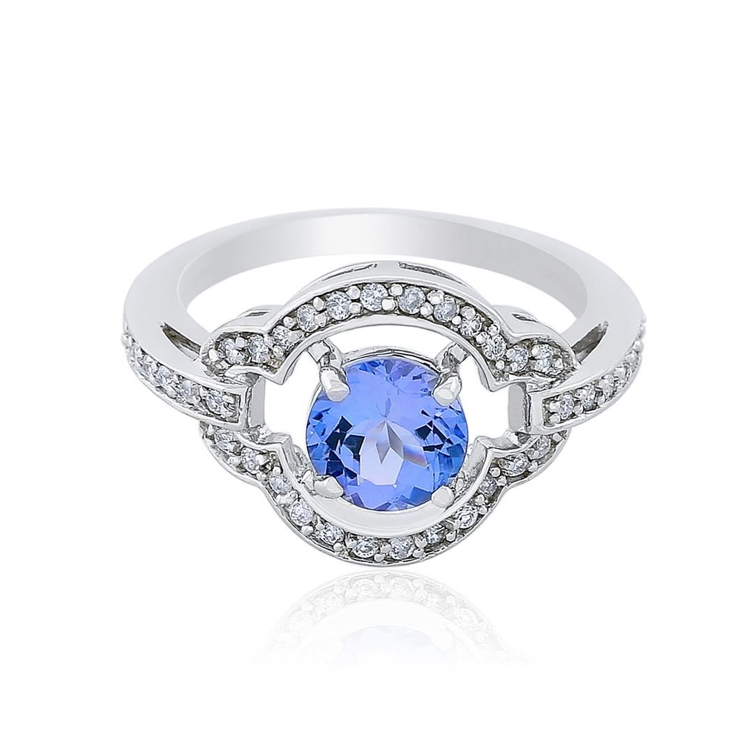 One electronically tested 14KT white gold ladies cast tanzanite and diamond ring with a bright polish finish. Identified with markings of "14K". Condition is new. Containing: One prong set round modified brilliant cut natural tanzanite, measuring 6.50 - 6.50 x 4.23 mm, approximate weight of 1.29ct., clarity is eye clean, type I, medium light, very slightly grayish, violet color, (GIA V 4/3), cut is good. The stone has been heat treated to improve the color. Thirty-Eight prong set round brilliant cut diamonds, measuring 1.20 - 1.10 x 0.69mm (depth est.) approximate total weight of 38 Stones = 0.25ct. Clarity: SI-2 to I-2. Color: I - J, Cut is Good. Colored gemstones are presumed to have been subjected to commonly used enhancement processes. All diamonds and colored gemstones are graded in the mounting, unless otherwise stated. Total Weight of Colored Stones 1.29ct. Total Weight of Diamonds 0.25ct. Total Weight of Ring 4.10 grams. GGL Appraised at $2,185.00.