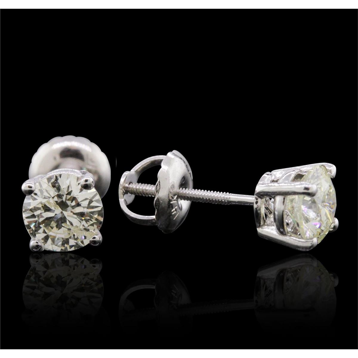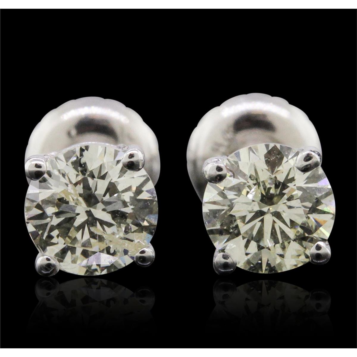 One pair electronically tested 14KT white gold cast & assembled diamond solitaire earrings with screw backs. Bright polish finish. Condition is new, good workmanship. Containing: One prong set round brilliant cut diamond, measuring 5.11 - 5.10 x 3.30mm (depth est.), 4.00% GTCF approximate weight of 0.64ct with a medium blue fluorescence. Graded in the setting. Clarity: I-1. Depth: 64.6%. Table 58.7%. One prong set round brilliant cut diamond, measuring 5.09 - 5.08 x 3.40mm (depth est.), 3.00% GTCF approximate weight of 0.65ct with a medium blue fluorescence. Graded in the setting. Clarity: SI-2. Depth: 66.8%. Table 57.0%. Total Weight of Diamonds 1.29ct. Total Weight of Earrings 0.96 grams. AIG Appraised at $4,290.00.