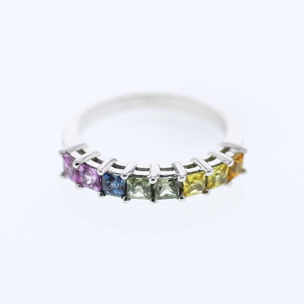 One 14KT White Gold 1.29ctw Multi Color Sapphire Ring. (8) Multi color sapphires with a total weight of 1.29cts. Total weight of this ring is 3.23 grams.