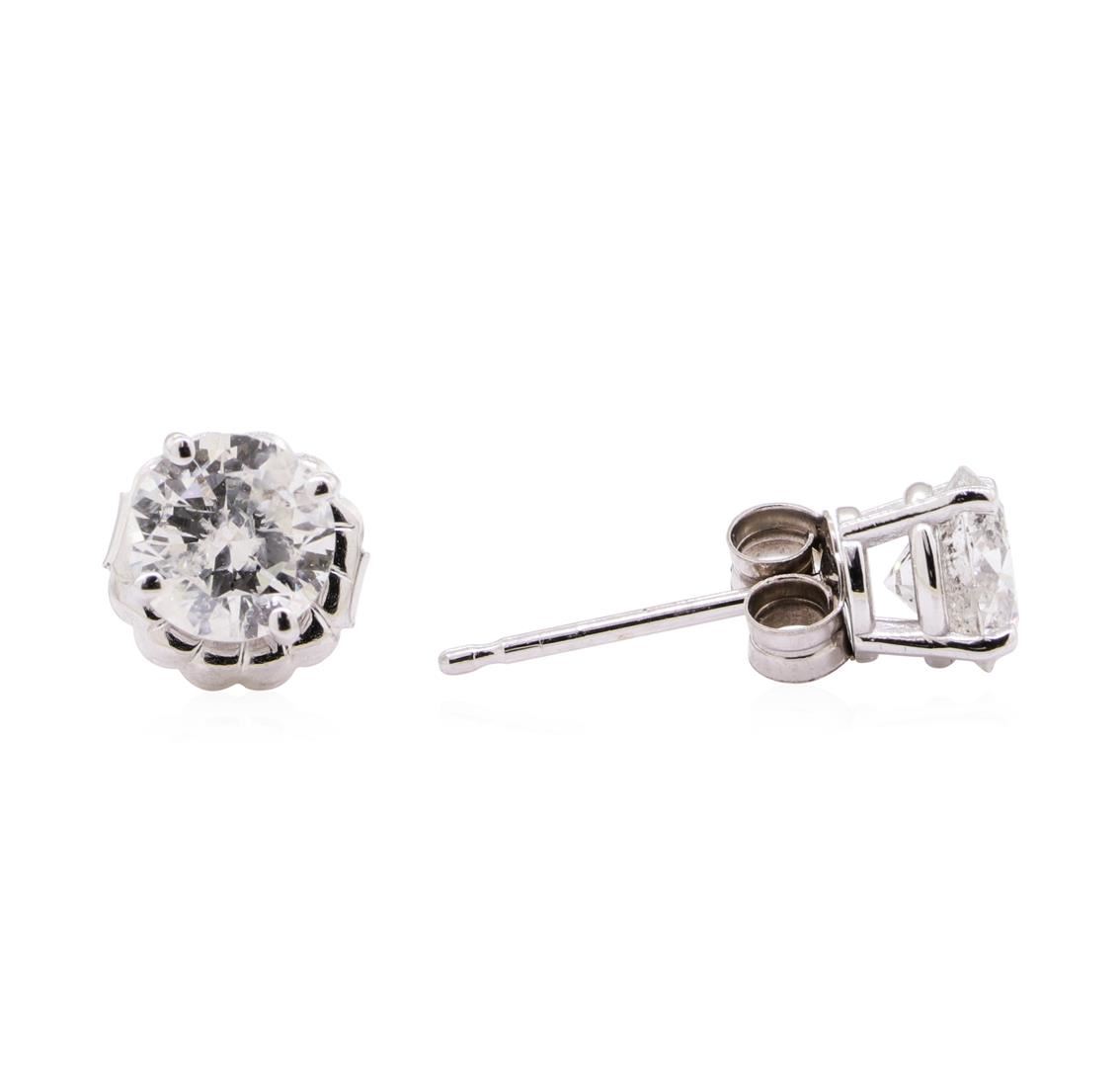 One pair electronically tested 14KT white gold lady's combination cast & assembled fashion basket stud earrings with friction posts with a bright polish finish. Identified with markings of '14K'. Condition is new, good workmanship. Containing: Two prong set round brilliant cut diamonds, measuring 5.60 - 5.54 x 3.45mm (depth est.) approximate total weight of 2 Stones = 1.30ct. Graded in the setting. Color H - I, Clarity I-1, Cut Good. Total Weight of Diamonds 1.30ct. Total Weight of Earrings 1.10gm. GAS Appraised.
