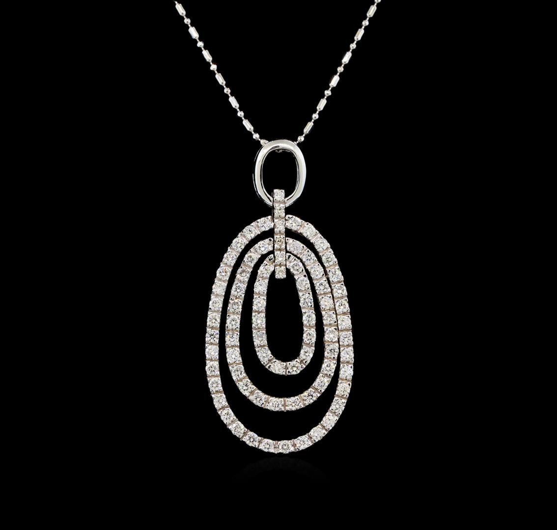 One electronically tested 14KT white gold ladies cast diamond pendant & chain 18.0" long, with a spring ring clasp with a bright polish finish. Identified with markings of "14K". Condition is new. Containing: Seventy-Eight prong set round brilliant cut diamonds, measuring 1.50 - 1.30 x 0.84mm (depth est.) approximate total weight of 78 Stones = 1.30ct. Clarity: SI-1 to SI-2. Color: G - H, Cut is Good. All diamonds are graded in the mounting, unless otherwise stated. Total Weight of Diamonds 1.30ct. Total Weight of Pendant & Chain 8.90 grams. GGL Appraised at $4,210.00.